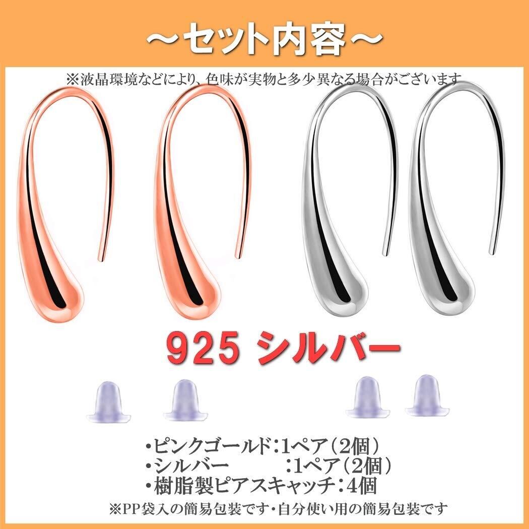 フックピアスドロップ型 ピンクゴールド色+銀色 各1ペア 計4個 (シリコンピアスキャッチ4個付き)