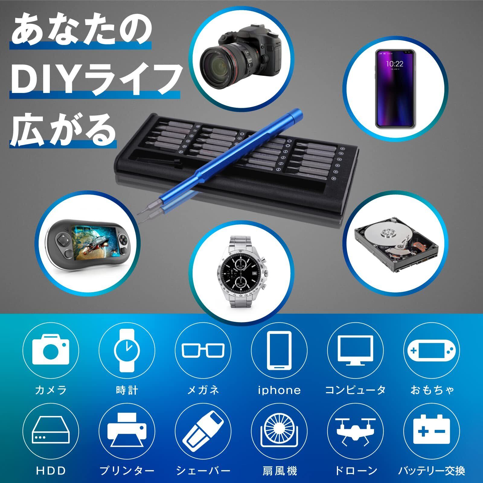 【豊富なビットの種類】精密ドライバーにはトルクスドライバー、y字ドライバー、星型ドライバーなどがあり、機械・スマホ・iPhone・ドローンなそのエレクトロニクスの分解・修理に役立ちます。ビットの種類は次の通りです。Y型:Y0.6, Y2.0 U型:U2.6 星形:P2 (0.8mm)、P5 (1.2mm) 三角:2.3 SIM +型: PH000(1.5) PH00(2.0) PH0(2.5) PH1(3.0) 六角:H1.5、H2.0、H2.5 -型:SL1.5 SL2.0 SL2.5 SL3.0 トルクス:T2、T3、T4、T5、T6、T8