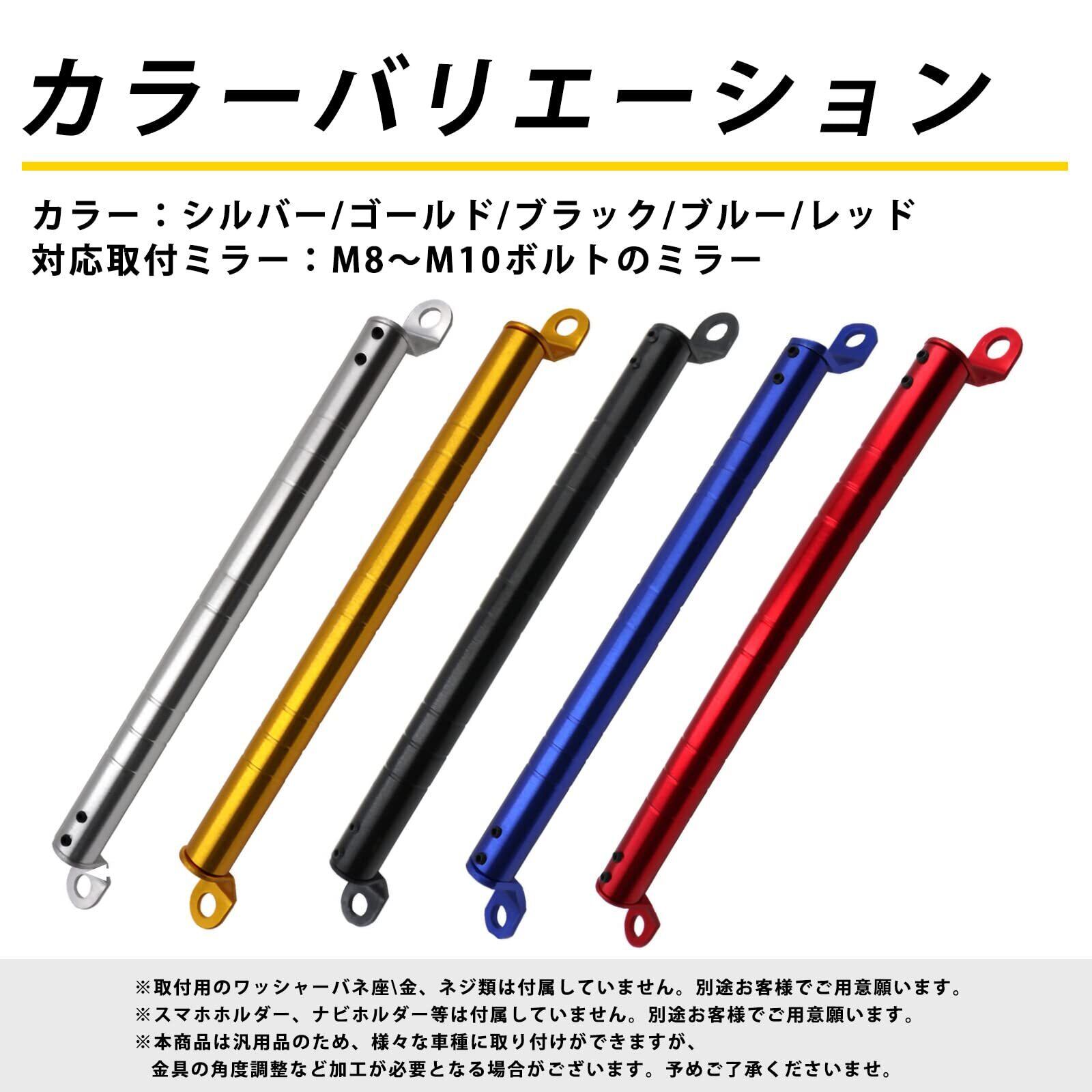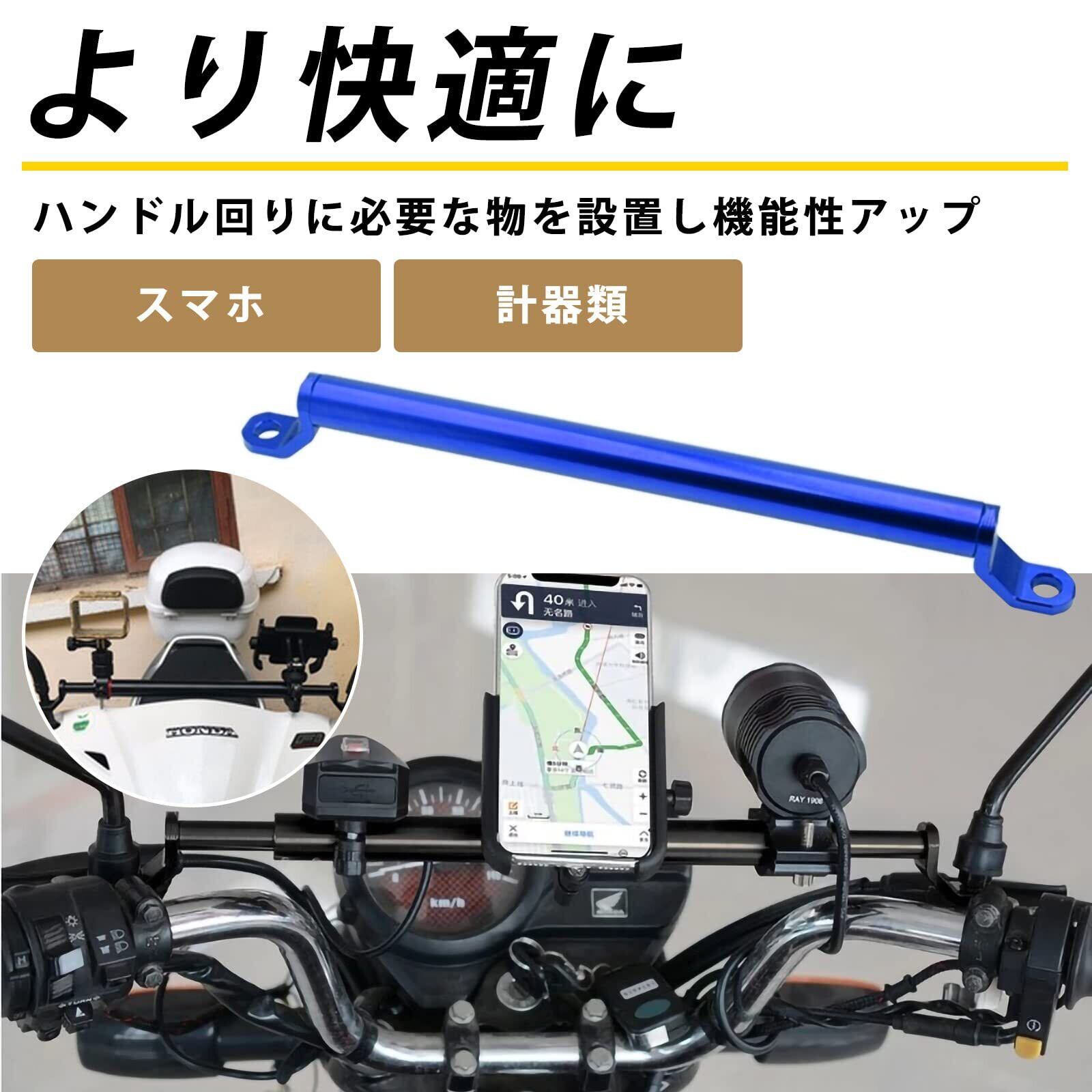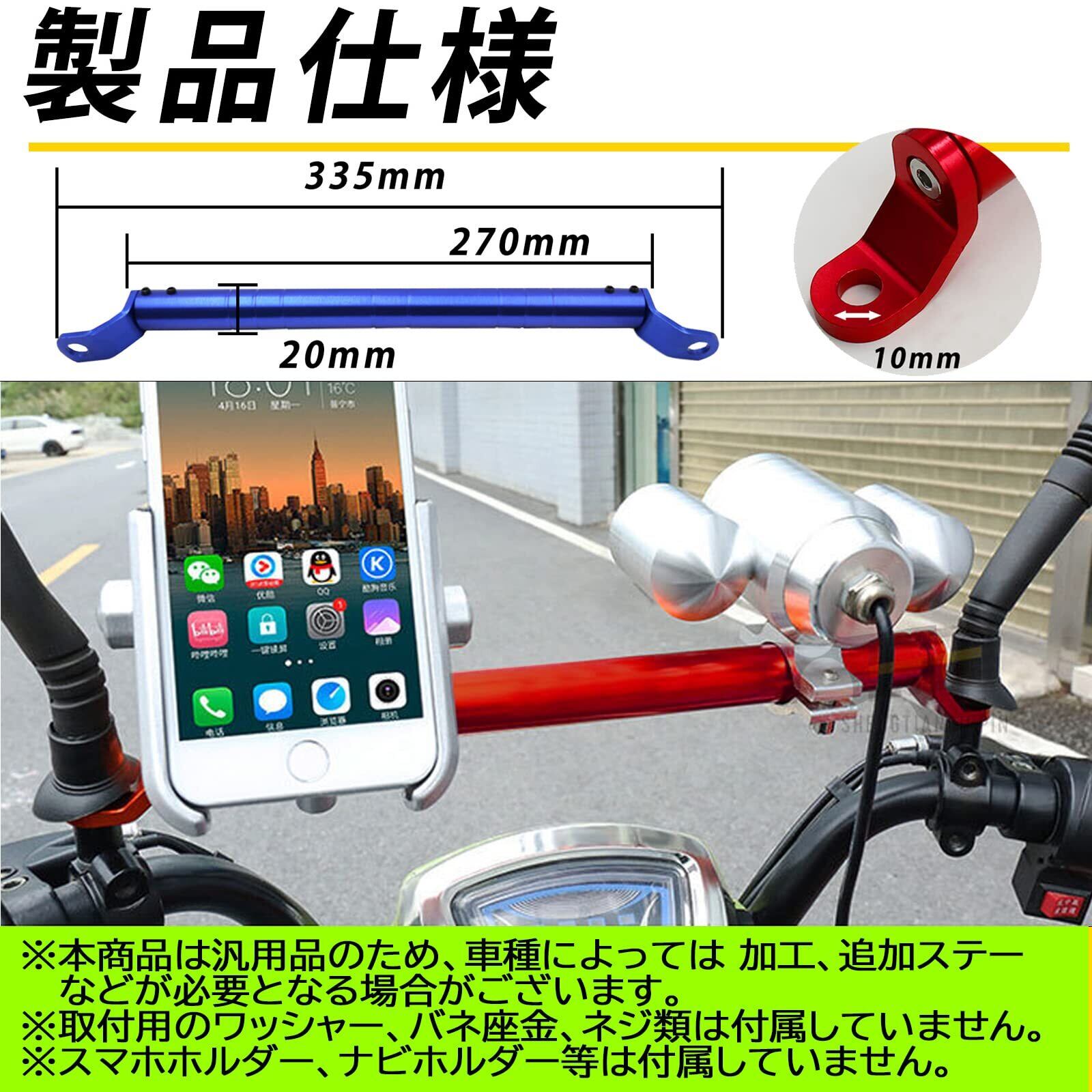 バイク スクーター 2輪車のミラーに共付け装着することにより、スマートフォンホルダーやナビゲーション取り付けの土台、計器類増設の土台になります。また、ハンドルの剛性の強化にもなります。 カンタン取付!バイクミラーの取付部分に共付けするだけ!アジャスタブルなので様々な幅に対応しています(左右ミラーのボルト中心間:32cm~42cmに対応.。車種によっては別途ステーや金具などが必要人になる場合があります。) お好みのカラーを選択することにより、ハンドル周りを鮮やかにカスタマイズすることが可能。 バイク用 ハンドル強化 ミラー拡張 スマホホルダー増設 計器類増設 ハンドル周りのドレスアップなどに おすすめです。 本体全長 33cm から 43cm(ボルト穴中心間:32cm から 42cm) (バー部分の長さ 約27cm から 37cm) 太さ 約20mm ネジ穴 約10mm 対応取付ミラー:M8~M10ボルトのミラー ※取付用のワッシャー、バネ座金、ネジ類は付属していません。別途お客様でご用意願います ※スマホホルダー、ナビホルダー等は付属していません。別途お客様でご用意願います ※本商品は汎用品のため、車種によっては取付け不可の場合や、加工が必要となる場合がございます。商品とお車を十分に比較し、取付可否はお客様まで判断願います。予めご了承くださいませ。