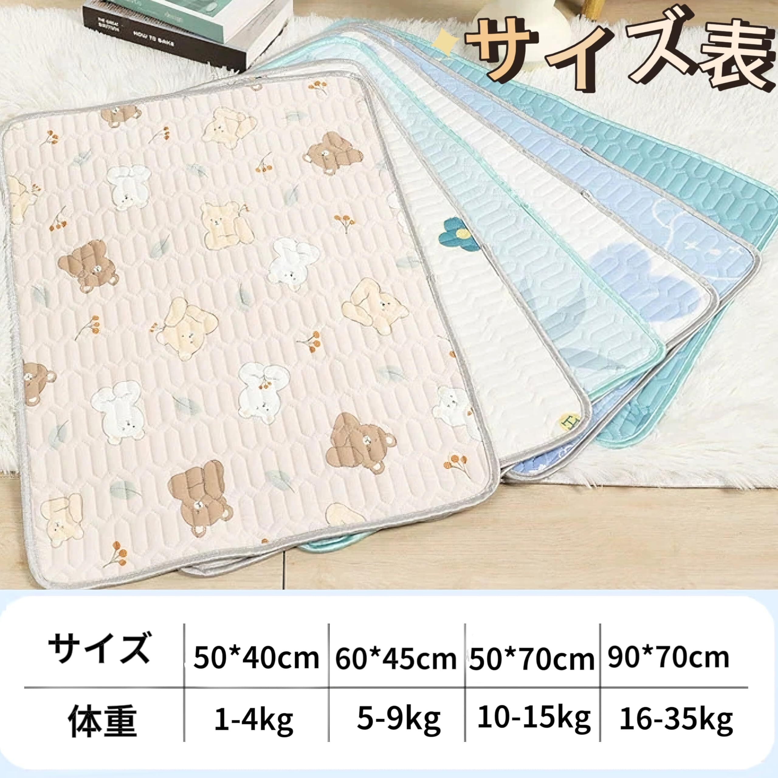 【豊富なサイズとデザイン】:このペット用おしっこマットは中型・大型犬、猫、うさぎ、モルモットなどの動物に適用しています。特に妊娠中や授乳中のペット、または失禁、糖尿病などの病気になる、介護必要があるペットに最適!涼感マットは4サイズ,(50*40cm 、60*45cm 、50*70cm,90*70cm )がありますので、そして10の異なる柄のデザイン(青葉 、白いクマ 、恐竜 、青いくまちゃん 、白い花 、緑のくまちゃんなど)ペットの体型を合わせて選んてください。
