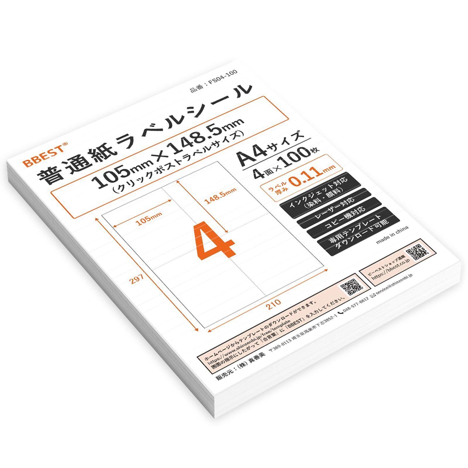 BBEST ラベル用紙 A4 普通紙 4面 100枚入り クリックポスト対応 インクジェット・レーザープリンター両用 シール用紙 ラベルシール 厚:0.10mm FS04-100