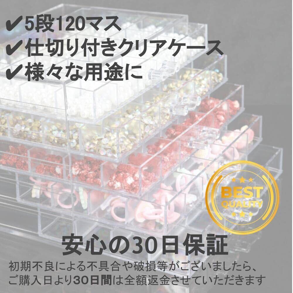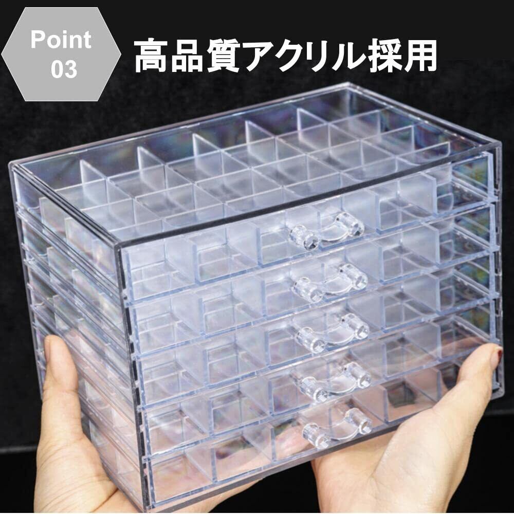 【5段120マスのクリアビーズキャビネット】耐久性のあるアクリル素材で質感がよく、細部まで精巧に作らせています。 【仕切り付きクリアケースでわかりやすい】引き出しを開けなくても中身が見えるので安心です。 【高品質アクリル採用】透明度が高く、丈夫な高品質アクリルを採用。アクセサリーケース、ネイル収納ケース、小物入れなどの小分けに最適です。