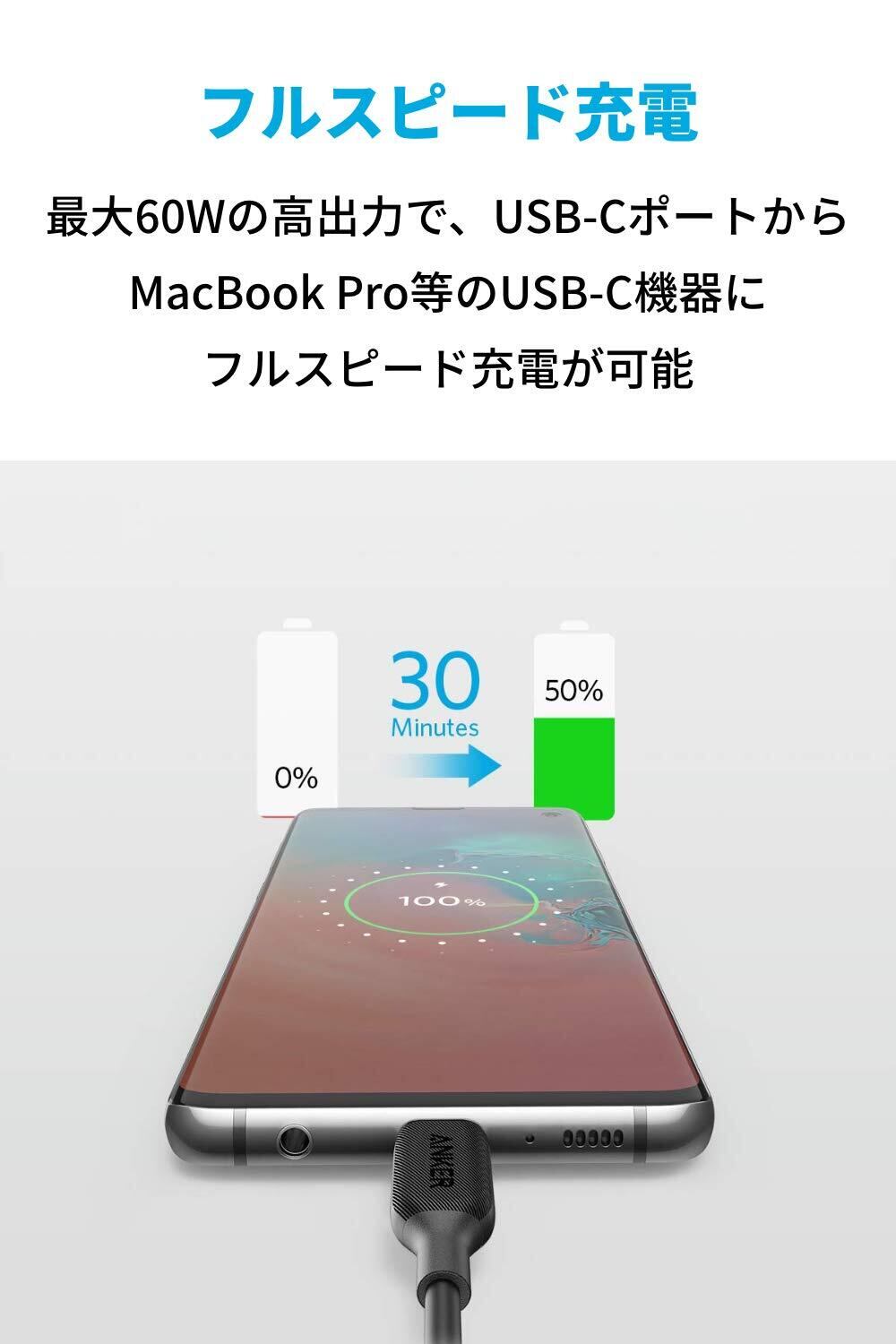 PD対応でフルスピード充電:最大60Wの高出力で、USB-C機器にフルスピード充電が可能です。PD対応の充電器と共に使用することでSamsung Galaxy S25にわずか30分で50%まで充電することが可能です。(充電器は別売)