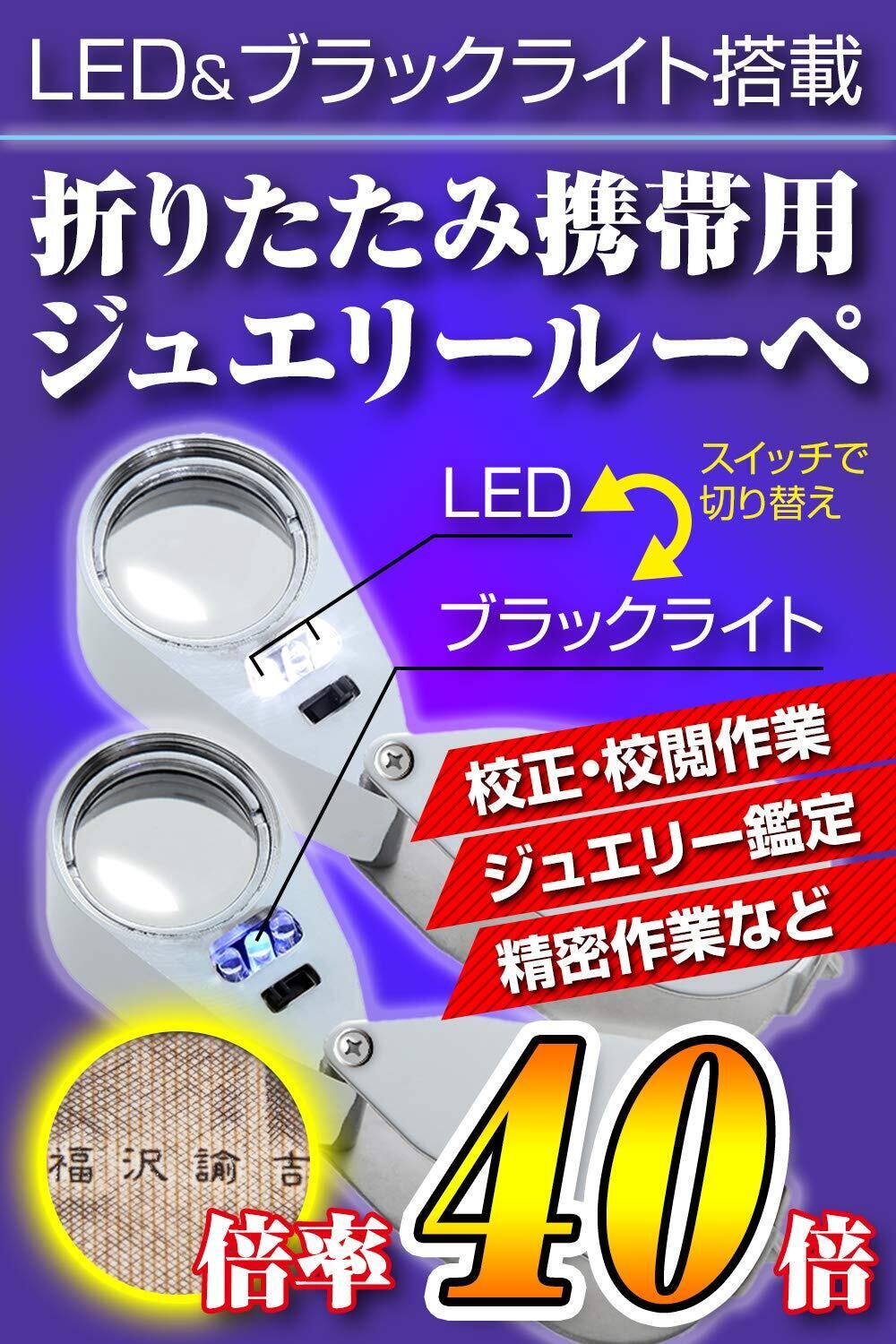 【倍率40倍!】ジュエリー鑑定・校閲作業など小型ルーペ!倍率40倍!LED&ブラックライト付きで暗所でもハッキリ見える!校正・校閲・観察・紙幣や骨董品の鑑定など細かい確認もでき重宝します。※LEDライトはスイッチで点灯いたします。※こちらのルーペは接眼ルーペとなります。【ご注意】高倍率のルーペの為、目を離して対象物を確認する場合は表示は反転いたします。反転は高倍率ルーペの特徴になります。ルーペに目を近づけてご使用くださいますようお願い申し上げます。