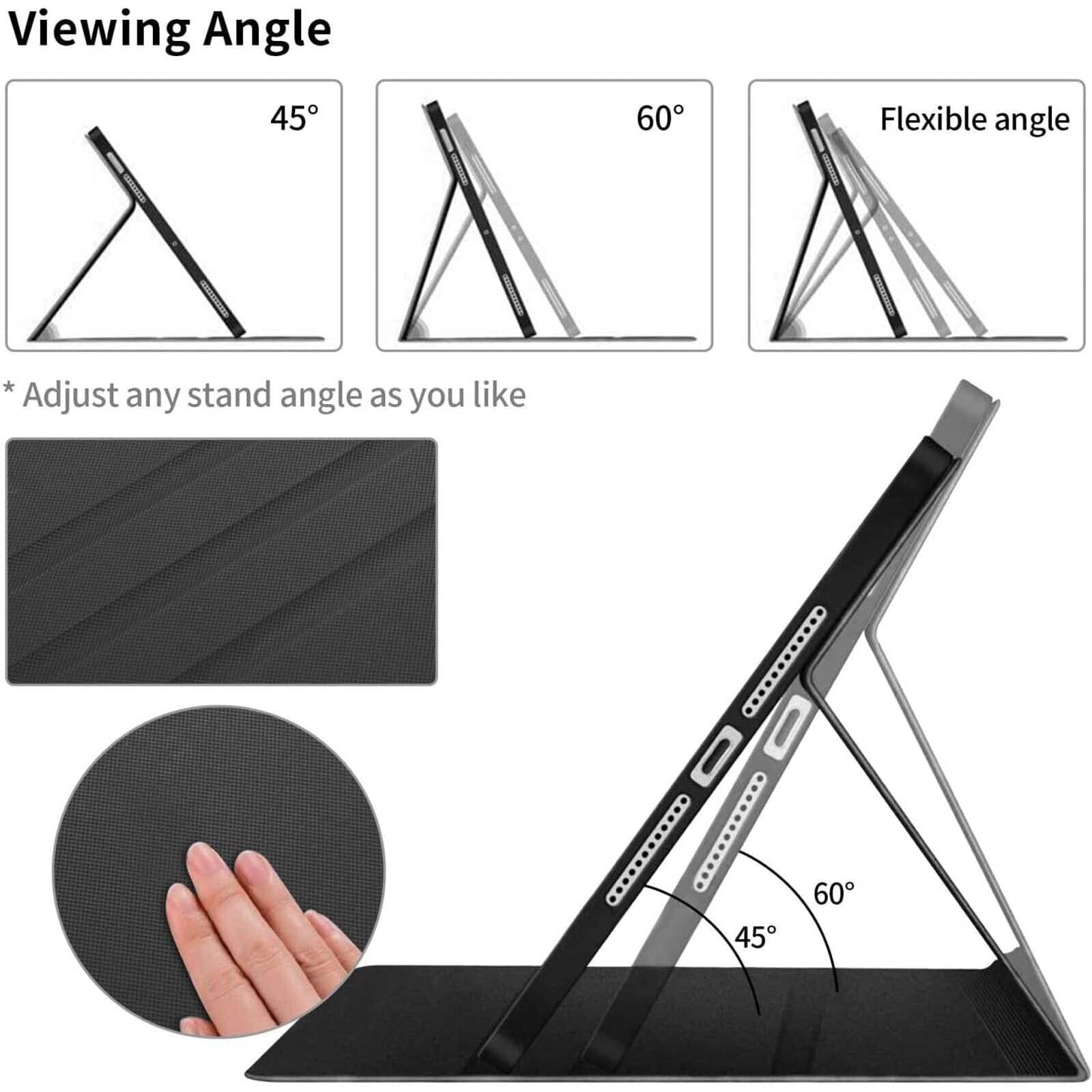 【スタンド機能付き】三つ滑り止め枠があり、お好みの角度を調整できます。また、タイピングモードは、仕事などの文字入力やメールなどの操作に便利で、鑑賞モードの場合はオンライン会議や動画、映画鑑賞などにおすすめです。