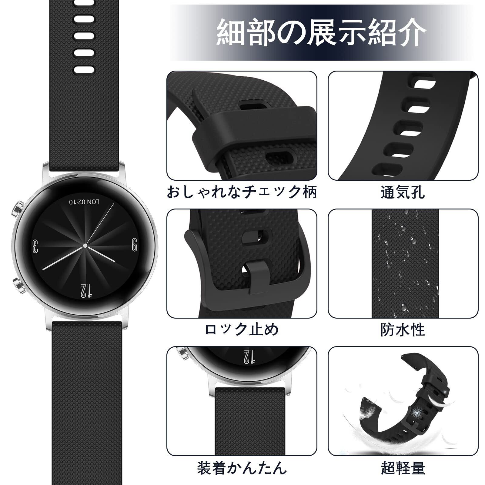 【高品質シリコンバンド】GOHHME製の交換バンドには高品質で環境にやさしいシリコンを採用されており、表面は滑らかで、耐水性、耐久性に優れています。 柔らかく、手首にフィットして装着も快適です。ラバー特有の嫌な臭いもなく、質感や手触りに優れ、柔軟性と強度を兼ね備えています。