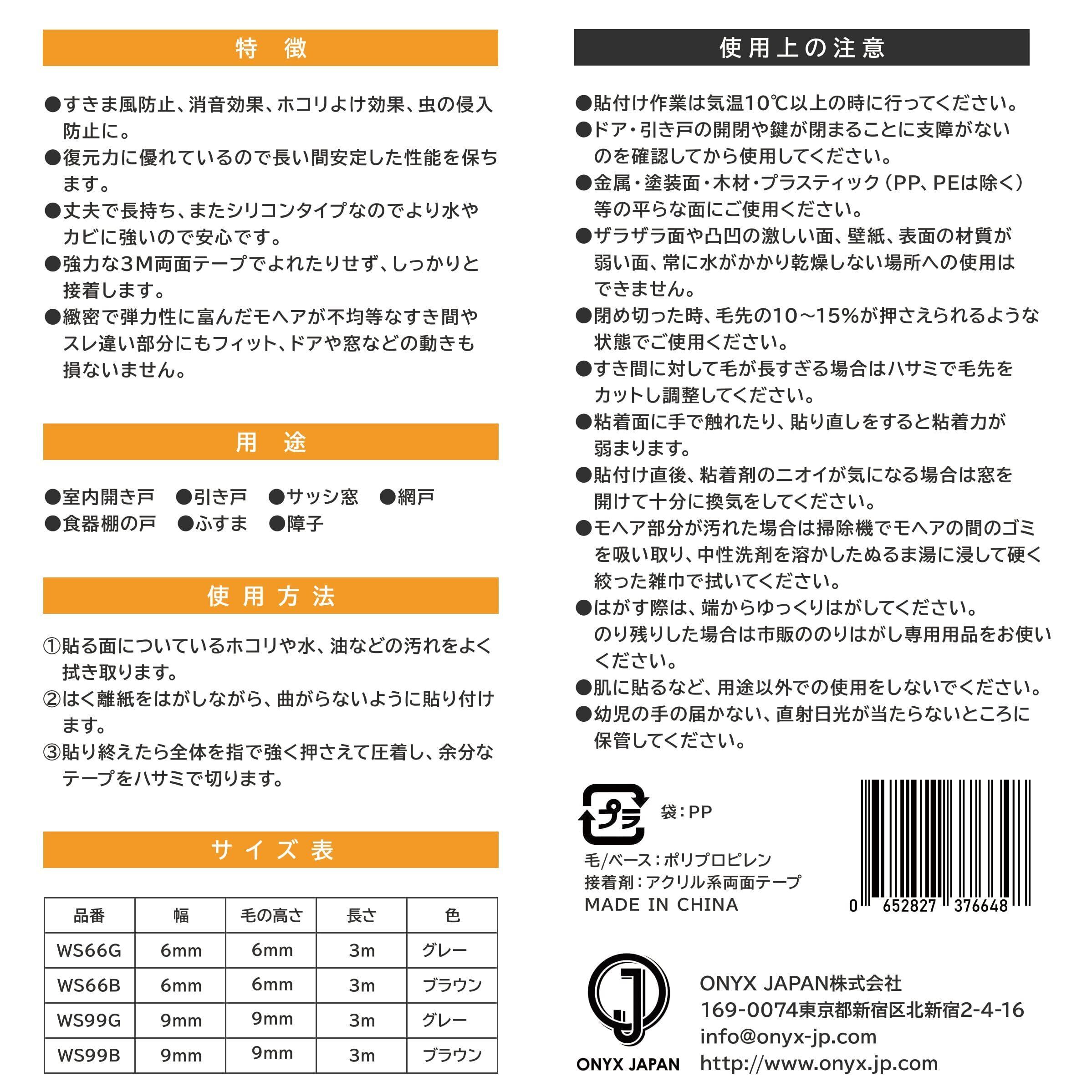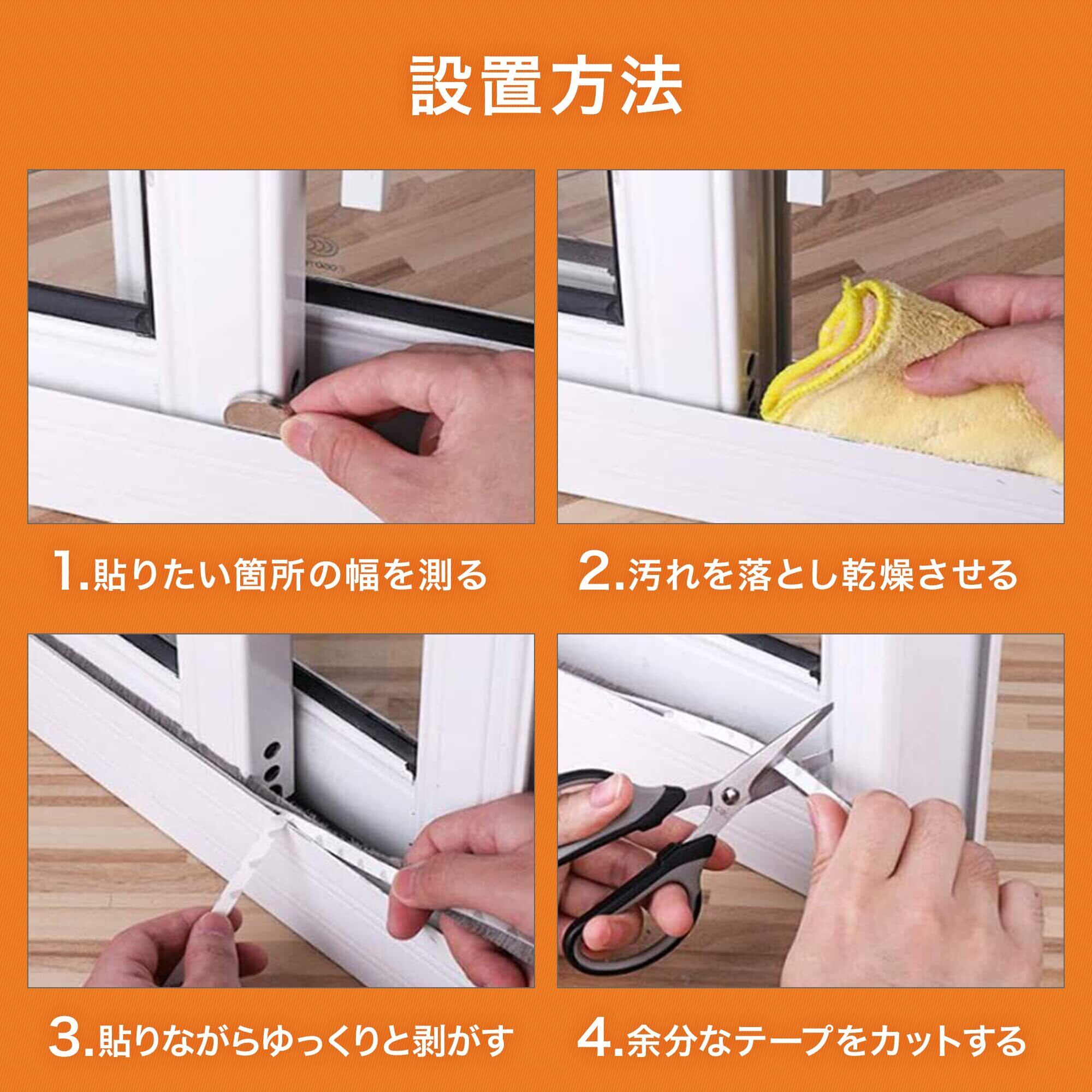 使用上の注意: ●貼付け作業は気温10℃以上の時に行ってください。●ドア・引き戸の開閉や鍵が閉まることに支障がないのを確認してから使用してください。●金属・塗装面・木材・プラスティック(PP、PEは除く)等の平らな面にご使用ください。●ザラザラ面や凸凹の激しい面、壁紙、表面の材質が弱い面、常に水がかかり乾燥しない場所には使用できません。●閉め切った時、毛先の10~15%が押さえられるような状態でご使用ください。●すき間に対して毛が長すぎる場合はハサミで毛先をカットし調整してください。●粘着面に手で触れたり、貼り直しをすると粘着力が弱まります。●貼付け直後、粘着剤のニオイが気になる場合は窓を開けて十分に換気をしてください。●モヘア部分が汚れた場合は掃除機でモヘアの間のゴミを吸い取ってから中性洗剤を溶かしたぬるま湯に浸して硬く絞った雑巾で拭いてください。●はがす際は、端からゆっくりはがしてください。のり残りした場合は市販ののりはがし専用用品をお使いください。●肌に貼るなと、用途以外での使用をしないでください。●幼児の手に届かず、直射日光が当たらないところに保管してください。