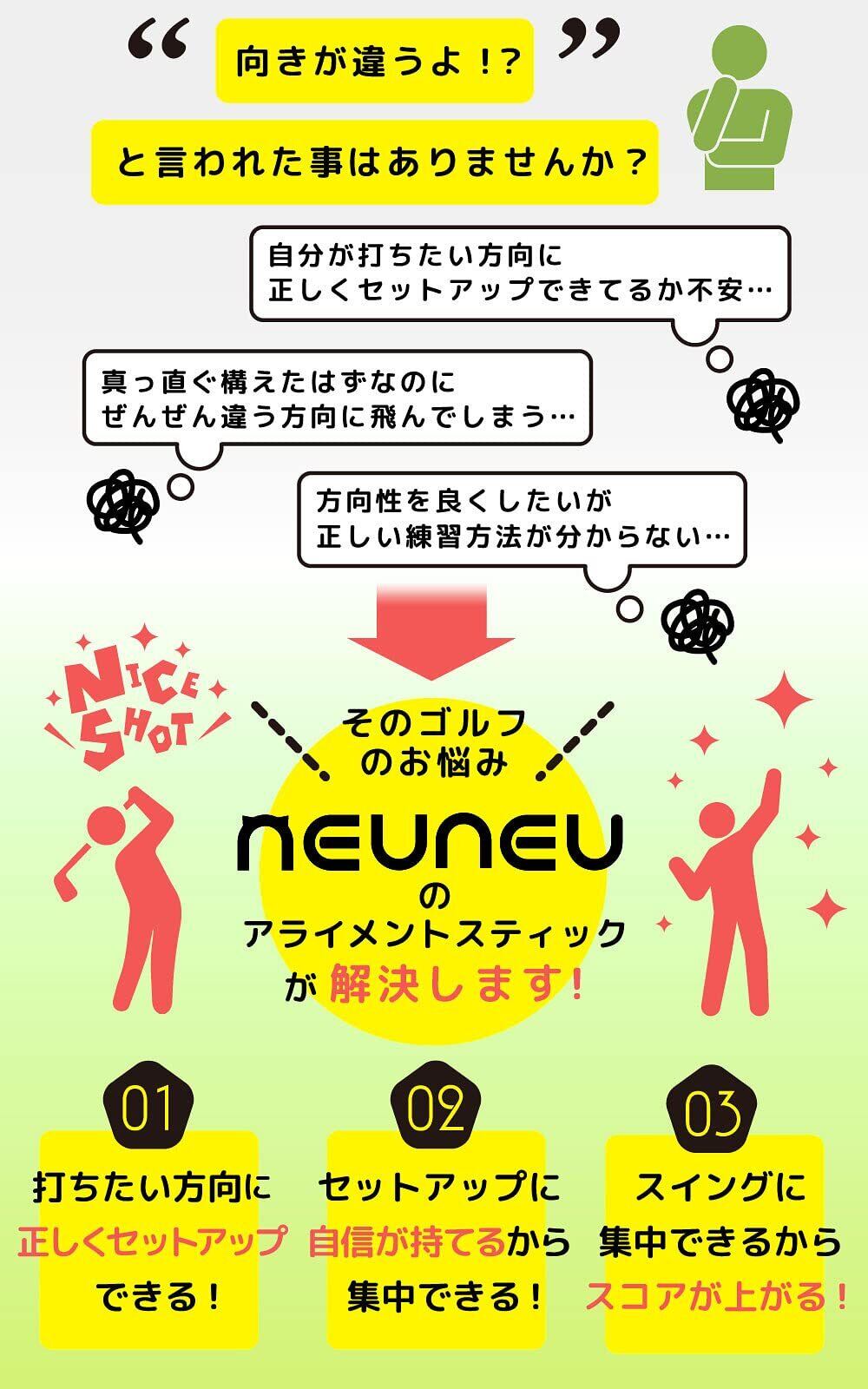 【 方向性 のお悩み解決 】 neuneu の アライメントスティック は PGA of Canadaティーチングプロ監修!! 方向性のお悩みに 効果がわかる ゴルフ練習器具 です。 毎回のアドレス で完璧な アライメント を保つことができ、さらに あなたの ゴルフ の色々なお悩みを解決して スコアアップ に役立ちます。