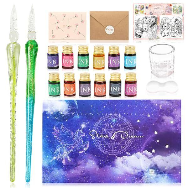 【セット内容】ガラスペン2本 (18cm)、インク12色 (7ml)、ギフトボックス型ペンホルダー、クリーニングカップ