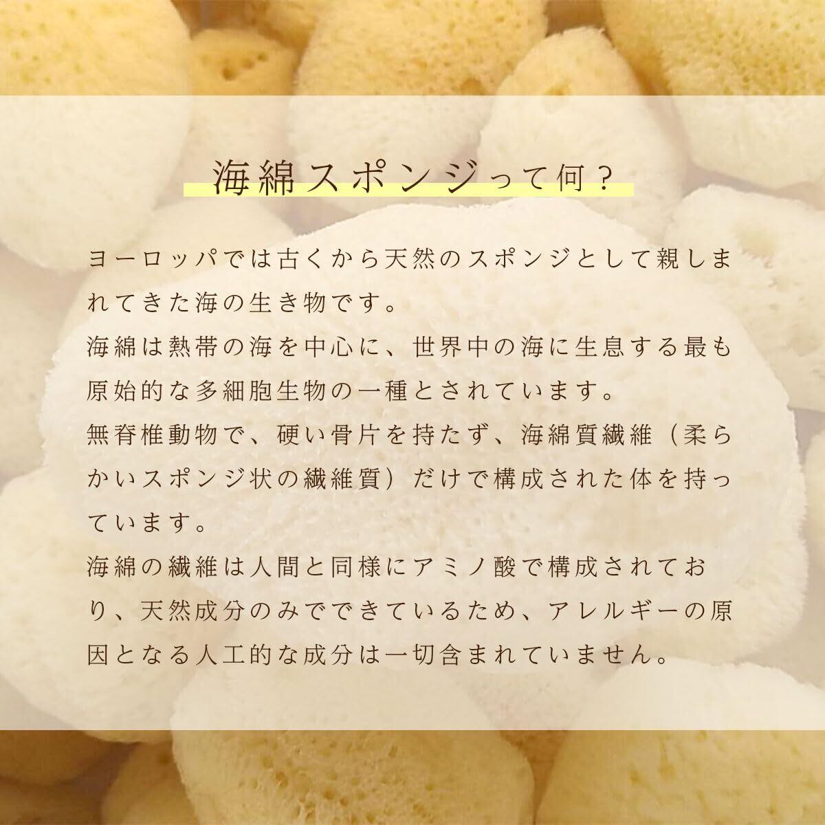 ■注意事項■ 天然素材のため、色・形状は一つ一つ異なります。直径約4~5cm (長い部分計測)、天然素材のため、ごくまれに微小の不純物(小石や貝殻等)が含まれていることがあります。ご使用前に不純物がないか確認してからご使用ください。 海綿の中に黒い点が見られる事がありますが、これは海藻の一部です。無理に取り出そうとすると海綿を傷めることになりますので、できればそのままご使用ください。 使用後は清潔に保ち、乾燥させてください。 適度に交換し、衛生的に使用しましょう。 万が一、異常を感じた場合は直ちに使用を中止し、専門医にご相談ください。 折りたたんだ状態で発送いたします。小さくなっておりますが、水分を含むと元の大きさに戻ります。※50℃以上の熱いお湯は海綿を傷めます。