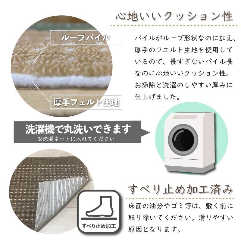 日本製 キッチンマット|サイズ:60×240cm 素材:表面 ポリエステル100%:裏面 不織布(ポリエステル)キッチンマット すべり止め加工済|パイル長(毛足):約 7mm|全厚:約 8mm|カラー:ベージュ|大阪・泉州にある自社工場からお届けするオリジナルキッチンマット。やわらか素材で折りたたみやすく扱いやすいのがこだわりポイント丸洗いできるので、汚れても大丈夫!(※洗濯機使用の際は洗濯ネットに入れてください。)|キッチンの他、ベッドサイドや廊下等にもお使いいただけます。床暖房対応しています。