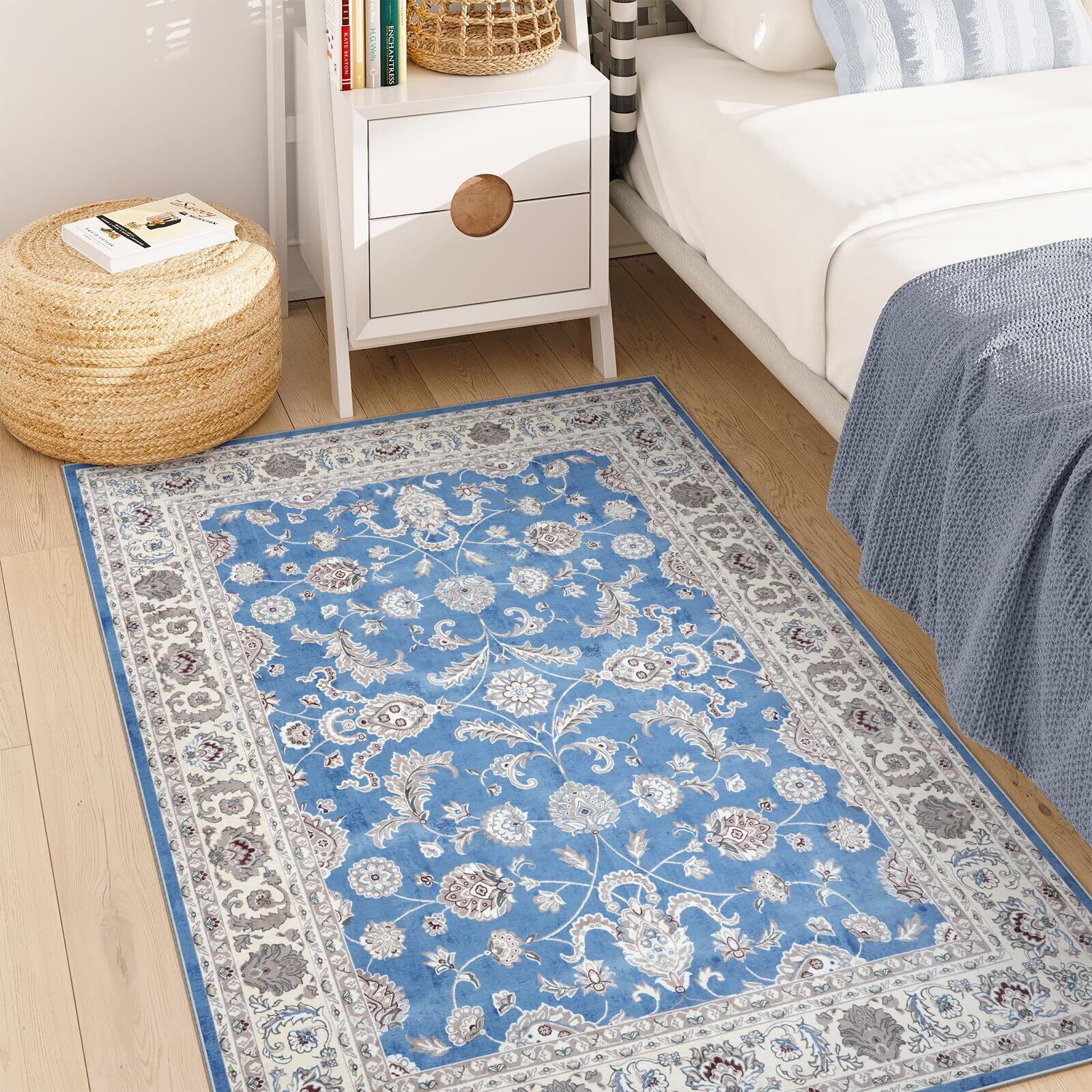 【新春セール】HAOCOO カーペット 洗える ラグ 130х190cm 1.5畳 ペルシャ絨毯風 おしゃれ 耐磨耗性 滑り止め ホットカーペット対応 防音 室内用 ラグマット シェニール オールシーズン適用 抗菌防臭 花柄 ライトブルー
