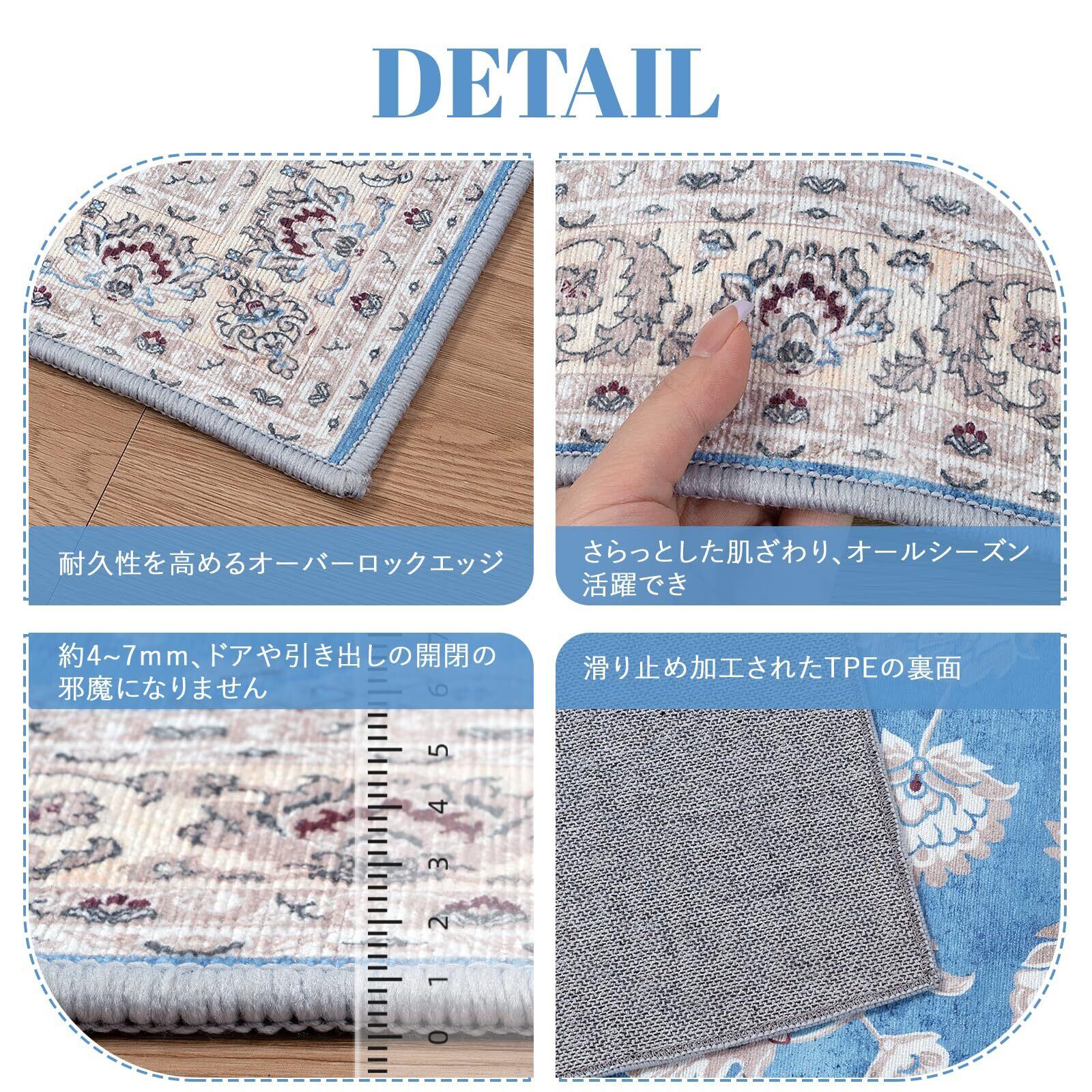 【多様な使用シーン】ラグは機械織り製造、丈夫で耐久性よい、床を保護だけでなく、インテリアとしても最適です。ベッドサイド、リビングルーム、ベランダ、やダイニングのテーブルの下などに敷くとぴったりです。角は細いパイピングで、軽やかな印象に仕上げています。ひっかかりやズレが生じにくく、生活導線に敷いても安心です。