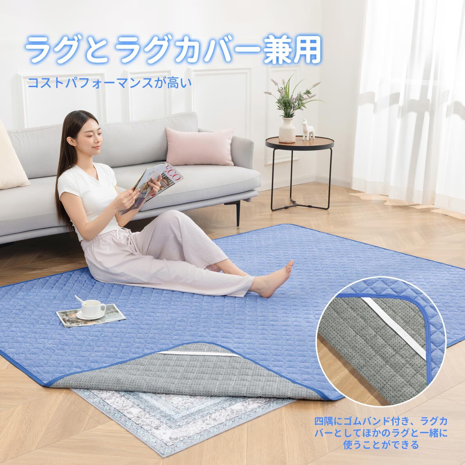 【滑り止め付き】 裏生地は滑り止め加工付きなので、ズレにくく、子供とお年寄りがいるお家庭でも安心して使える。四隅にゴムバンド付き、ラグとして使用するだけではなく、ラグカバーとしても使用できる、洗濯不便な冬ラグ(厚い/毛足長い)を保護します。
