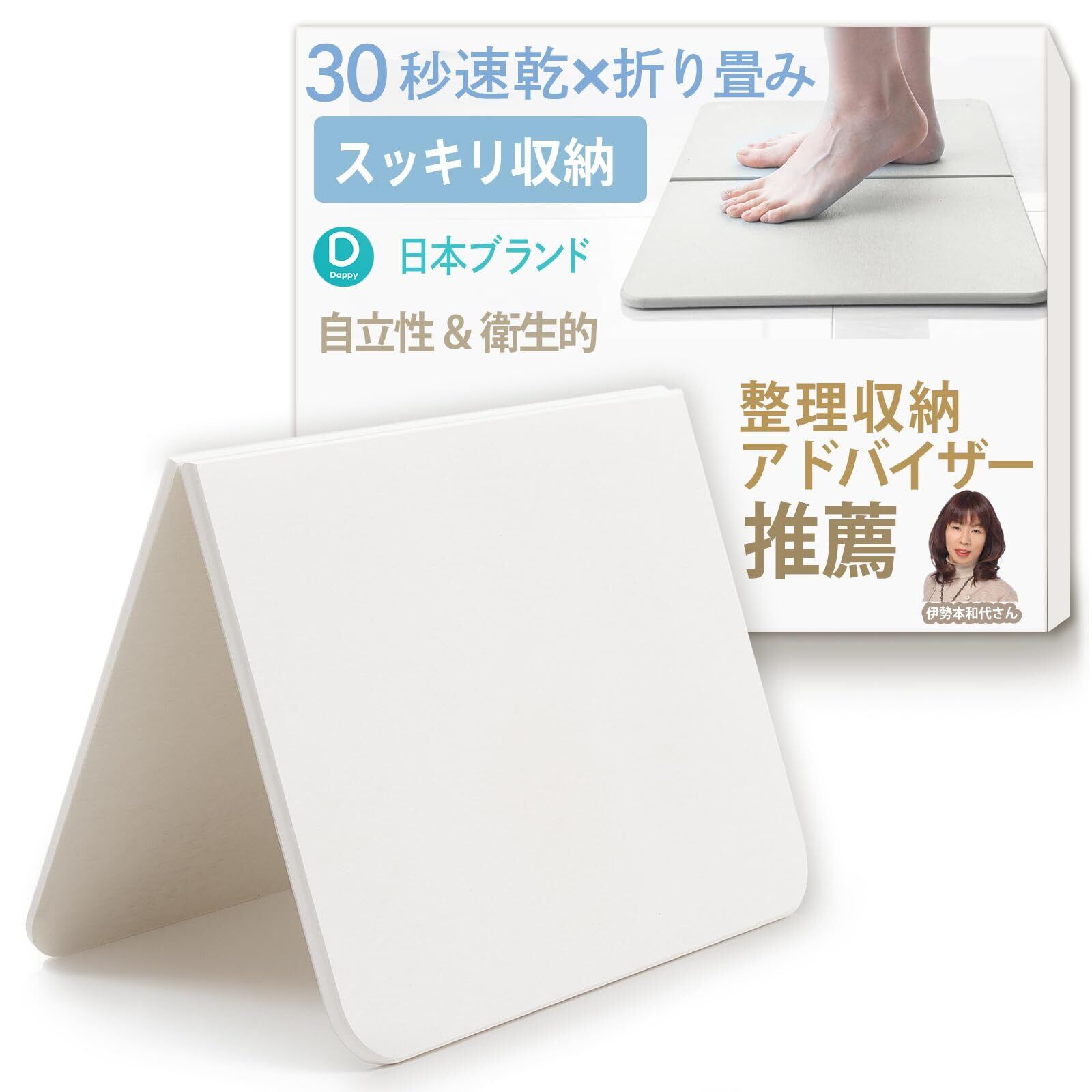 【整理収納コンサルタント推薦】Dappyの珪藻土バスマットはスタンドやマグネットが必要なく, 吸水と乾燥と収納が一つで完結する優れモノです。 濡れた足を載せた30秒後には,足形もなくなっている速乾性と床にも壁にも合うナチュラルなグレー。 まさに実用と外見の才色兼備な珪藻土バスマットをぜひお試しください。