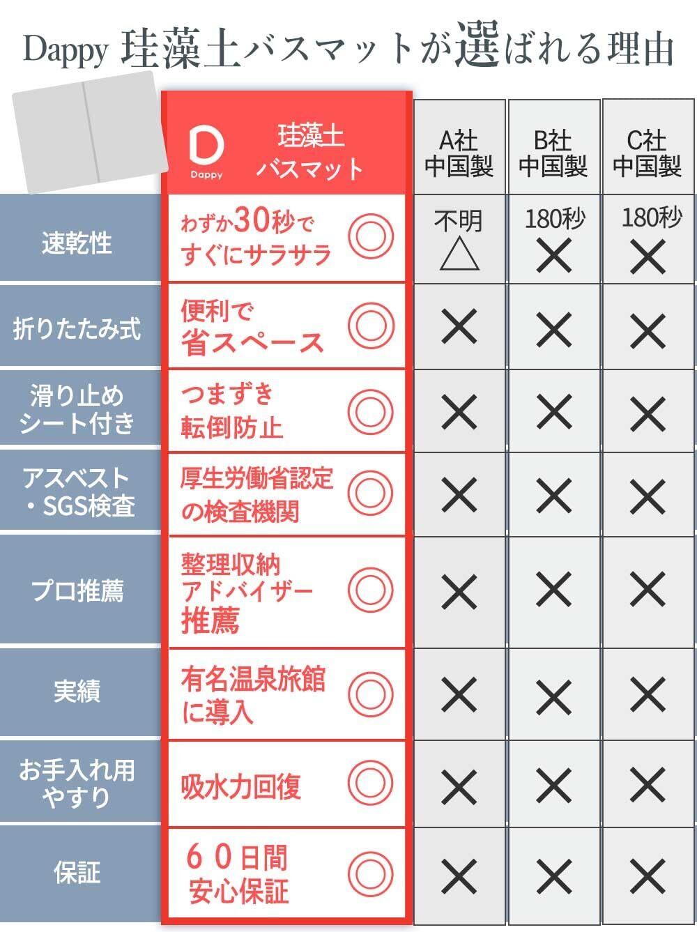 【吸水速乾】Dappyの珪藻土バスマットは吸水性が高い珪藻土を使用して、 踏んだ瞬間1秒で足の水分をすぐ吸収して、足元をサッと乾かしてくれます。 また、優れた速乾性により、カビや細菌の繁殖を抑えられます。