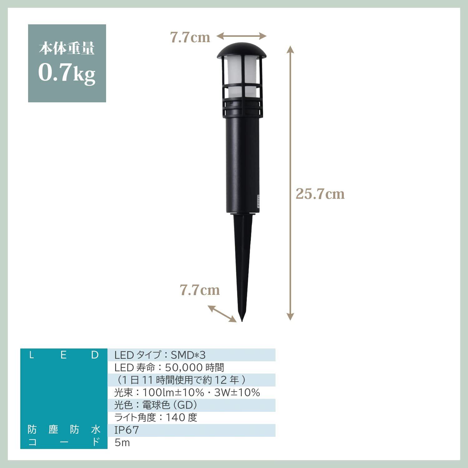 【本体仕様】ライト部分サイズ:7.7×7.7×25.7㎝/ライト重量:800g/材質:アルミニウム、PC/コード長さ:5m/付属品:ガーデンライト本体×1/屋外用PSE認証取得済み ※ACコントローラーは付属しておりません。初めてご購入の場合はスタートキットをご検討ください※
