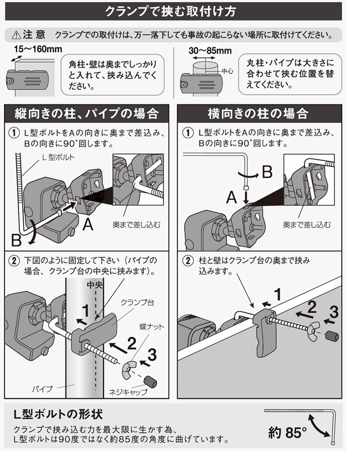 取付可能サイズ:【角柱】15~160mmまで対応、【丸柱】30~85mmまで対応