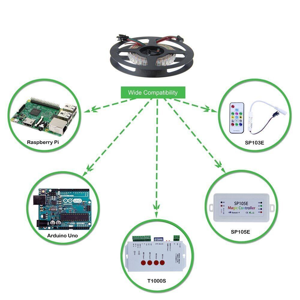 【簡単にプログラム】WS2812B LEDテープは Arduino, FastLED library, Raspberry Pi, FadeCandy, T1000Sなどを利用してプログラムすることができ。また、SP105E, SP103E(ASIN:B06XSDNCYZ), HC008 と他の予備プログラミングのws2811コントローラ制御できます。