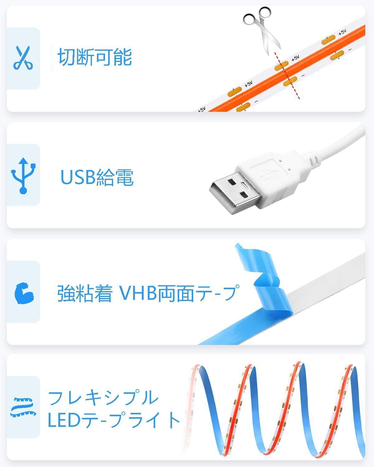 【5V USB COB LEDテープライト】1M 320leds/m, DC5V, 9W/M, レッド , CRI>85, 超明るい,高密度。本製品は、DC5V USBポート、携帯充電器/USB HUB/USBソケット/コンピュータホスト/テレビなどで使用することができます。このUSB COB LEDテープライトは、日常の使用に非常に適しています。持ち運びに便利で、操作も簡単です。USBケーブルの長さは1メートルで、十分な長さで簡単に接続できるのが素晴らしい!現代的な照明とインテリアの第一選択です。