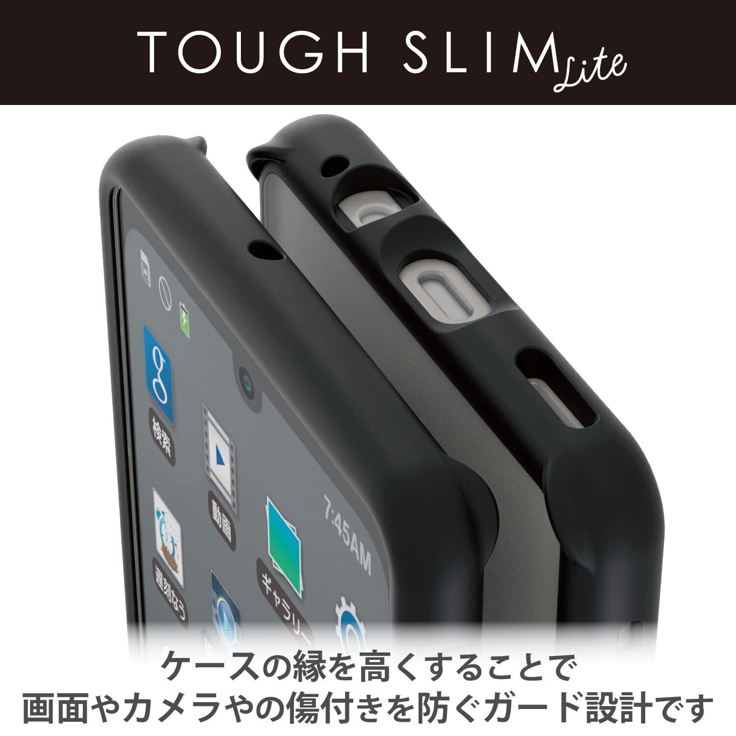 全周に配置した独自設計のエアクッションが衝撃を吸収し、背面には指紋が付きにくい特殊樹脂を採用した、AQUOS sense7(SH-53C/SHG10)用TOUGH SLIM LITEケースです。