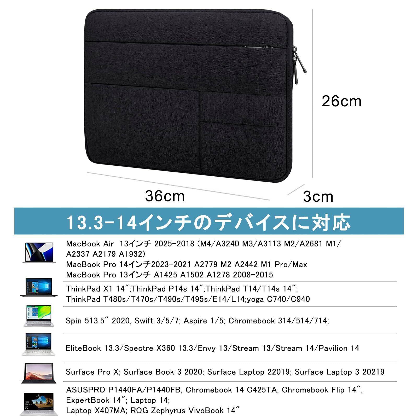 ノートPCバッグのサイズ:約36×26×3cm(外寸) 35.5x25x2cm(内寸)。MacBook Air 13インチ 2025-2018 (M4 M3 M2/A3240 A3113 A2681 M1/A2337 A2179 A1932), MacBook Pro 13-14インチ 2024-2016 (M4 M3 M2 M1 A2338/A2289/A2251/A2159/A1989/A1706/A1708), iPad Pro 12.9インチ (1st/2nd/3rd/4th/5th Gen) 2015-2022, XPS/Latitude 13, HP Pavilion 13, ThinkPad/Yoga 13.3, MateBook 13※ご購入の際は必ず画面サイズだけでなく本体のサイズをお確認の上お買い求めください.す!