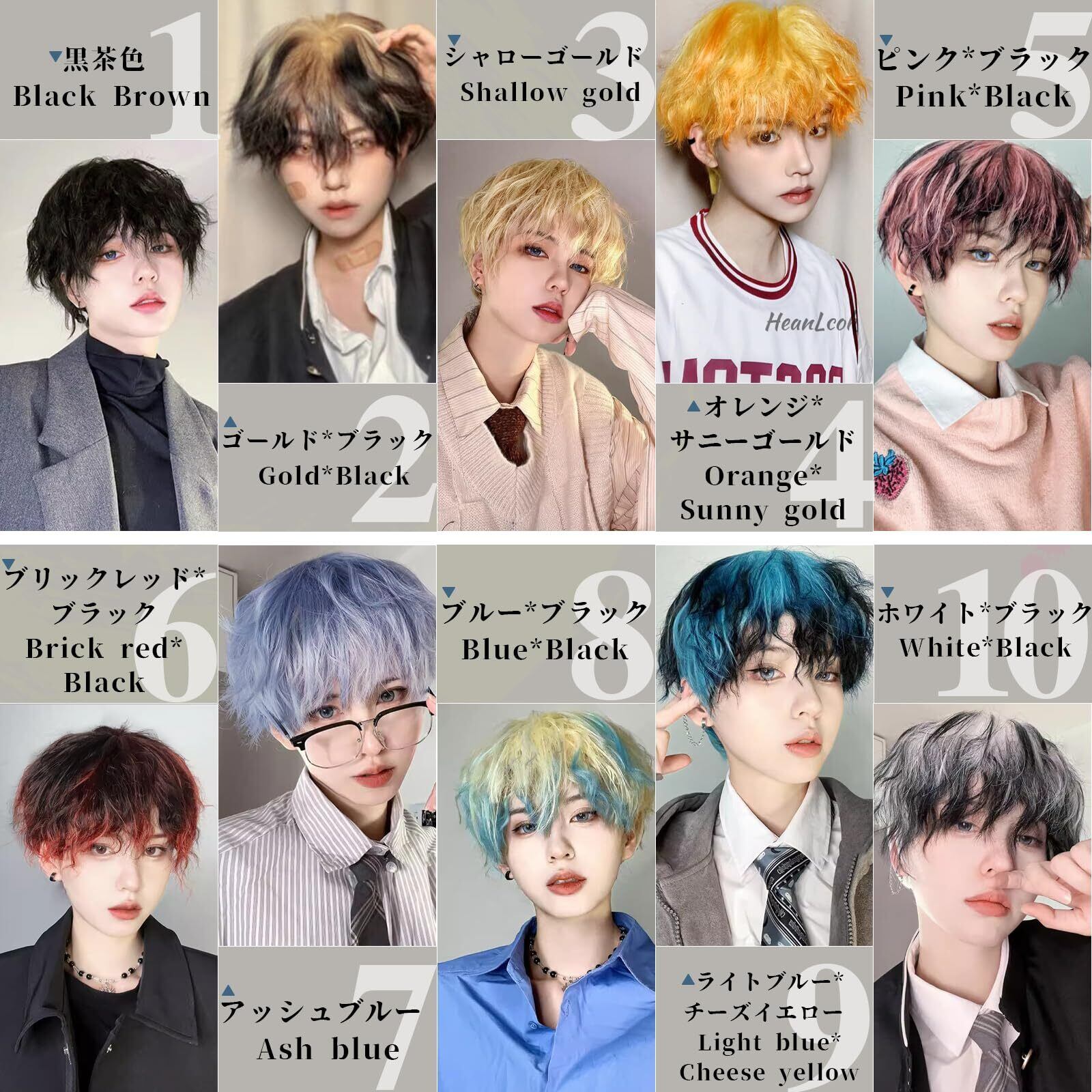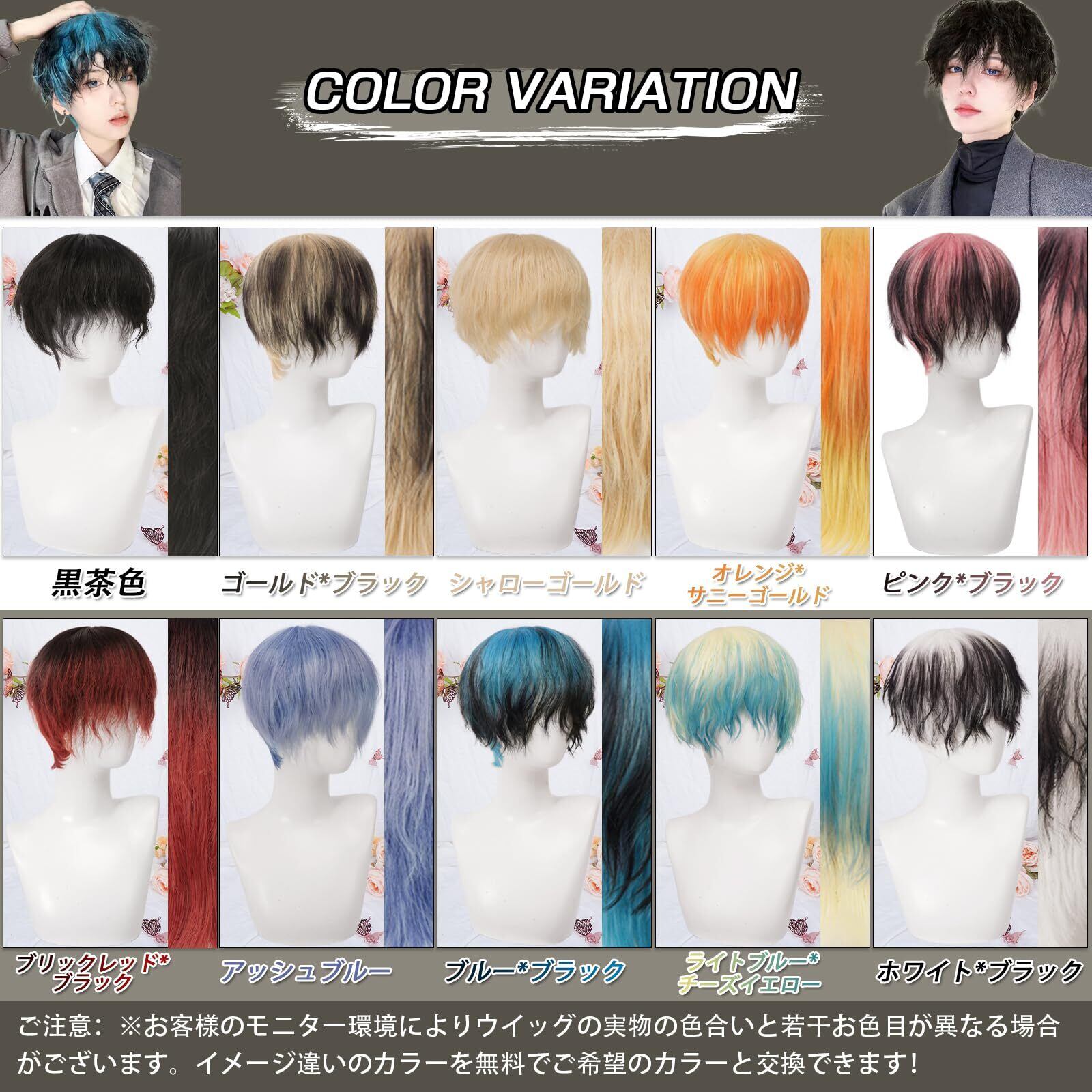 ❀豊富なカラー:①ピンク*ブラック②ブルー*ブラック③ブリックレッド*ブラック④ホワイト*ブラック⑤ゴールド*ブラック⑥オレンジ*サニーゴールド⑦ライトブルー*チーズイエロー⑧黒茶色⑨アッシュブルー⑩シャローゴールド。グラデーションカラーのコレクション!日本の男性に人気のカラーウィッグを集めました!学生でも大げさでなく着こなせます!Hawkkoのカラーの中でメンズウィッグの魅力を引き出す単色やグラデーションカラーを選びましたので、同じスタイルでもまったく違う印象になります!※(商品の色味は出来るだけ現物に近い色を再現するように努めておりますが、撮影環境やモニター環境により色の見え方に差異がございます。予めご了承ください。)