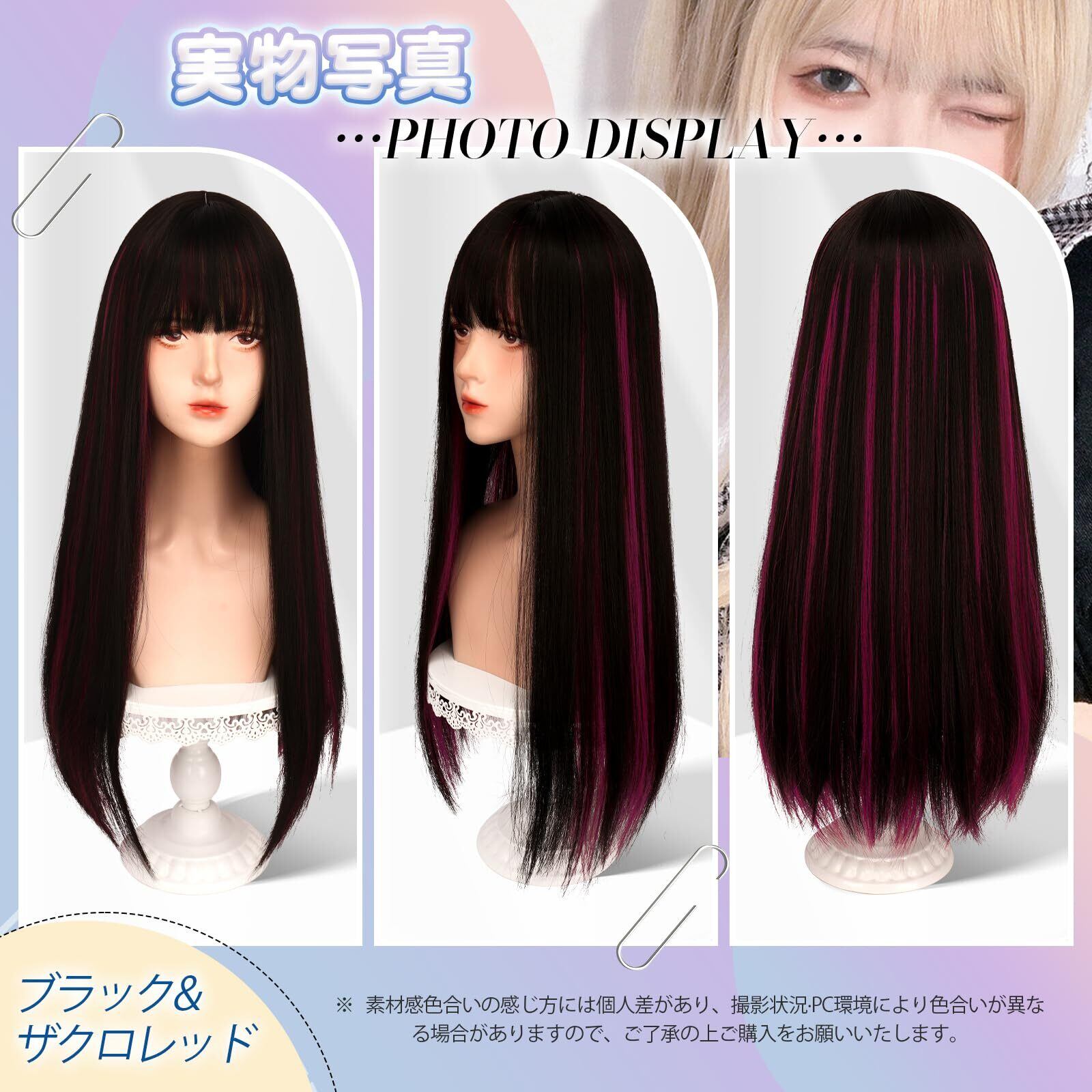 FESHFEN ウィッグ ロング ストレート インナーカラー かつら 自然 ウィッグ 黒髪 女装 フルウィッグ カツラ ロングウィッグ レディーズ カツラ wig ウイッグ 小顔 ロングヘア ぱっつん前髪 韓国風 耐熱 小顔 人気 黒 ネット/櫛付き ブラック&ザクロレッド