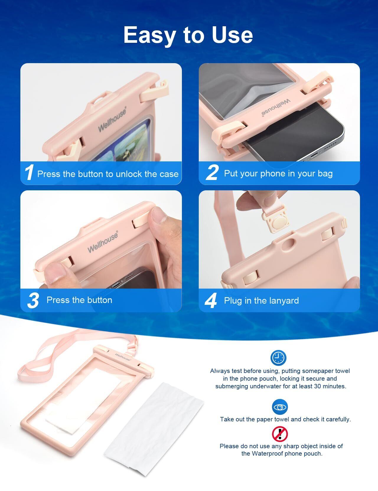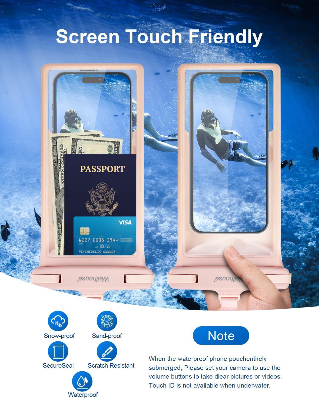 Wellhouse防水携帯電話バッグ、新しい3D立体成形デザイン、環境に優しいTPU一体型射出成形を採用し、新しいプロセスで超透明なTPUフィルムとTPUバッグ本体を融合させ、防水性能を大幅に向上させます。