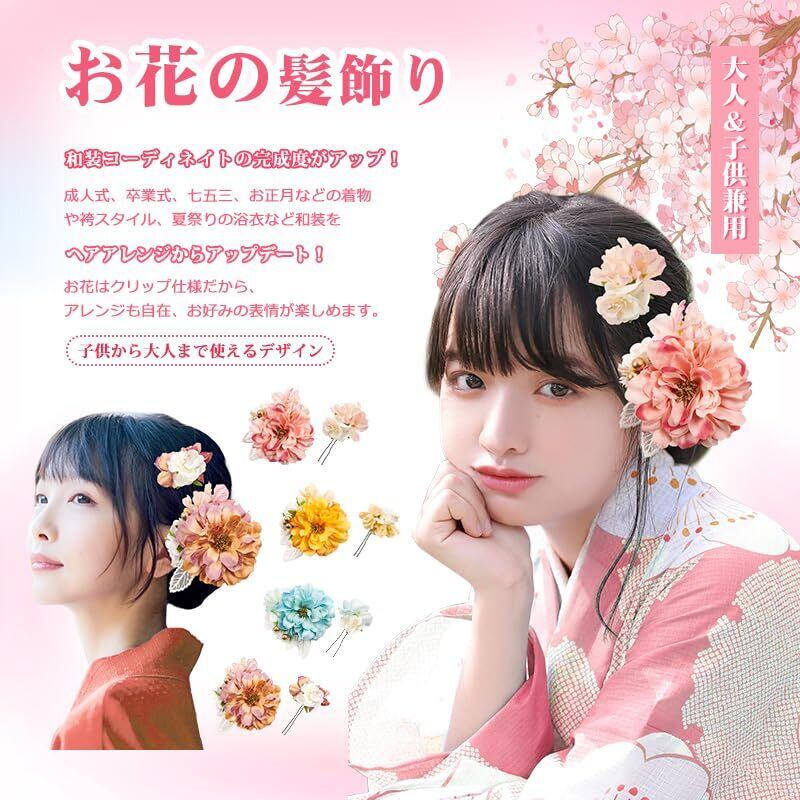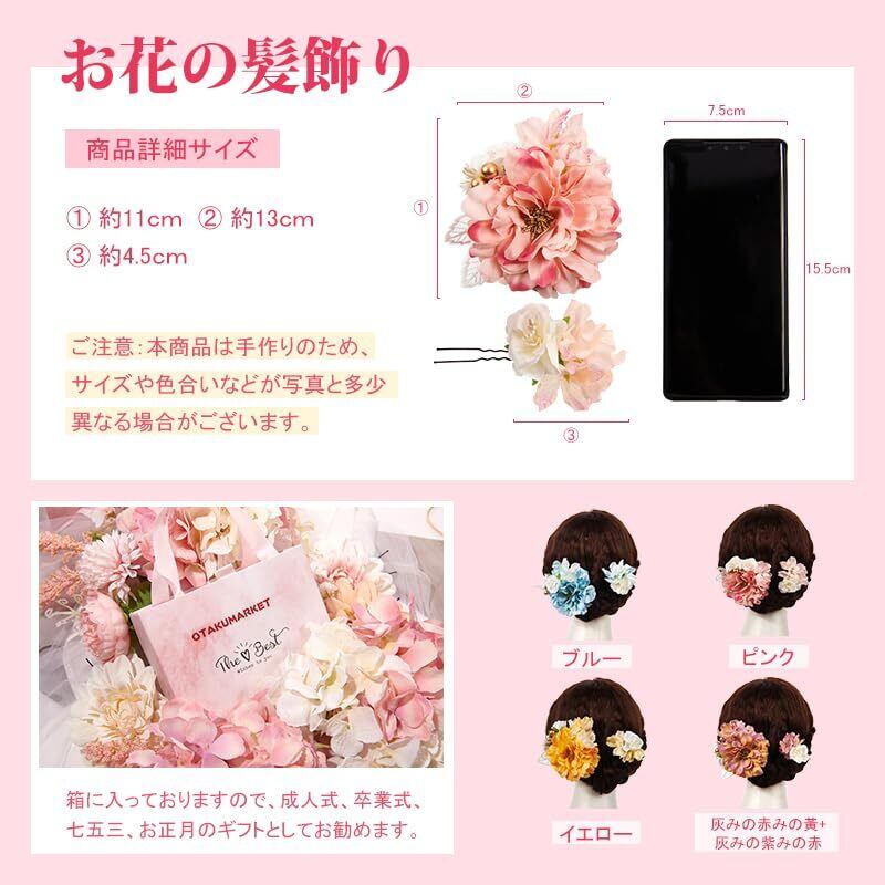 【用途】お花の髪飾りです。成人式の髪飾りは前撮りに最適。夜会巻き、アップヘア、サイドアップ、お団子、編み込みなど人気のまとめ髪の補助やアクセントにオススメです。子供さんは卒園式・七五三・お正月・お祝い事・桃の節句などにオススメです。大人の方は結婚式・パーティー・謝恩会・成人式・卒業式など華やかなお席の和装、振袖姿や浴衣のコーディネートにぴったりします。