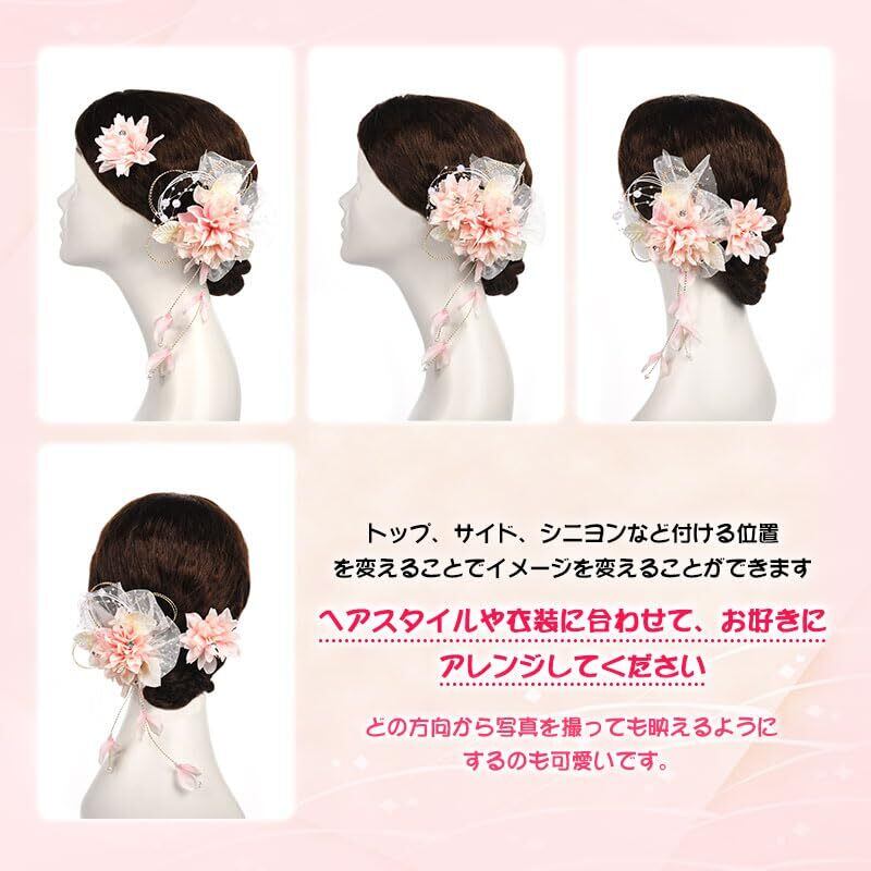 【用途】お花の髪飾りです。成人式の髪飾りは前撮りに最適。夜会巻き、アップヘア、サイドアップ、お団子、編み込みなど人気のまとめ髪の補助やアクセントにオススメです。子供さんは卒園式・七五三・お正月・お祝い事・桃の節句などにオススメです。大人の方は結婚式・パーティー・謝恩会・成人式・卒業式など華やかなお席の和装、振袖姿や浴衣のコーディネートにぴったりします。