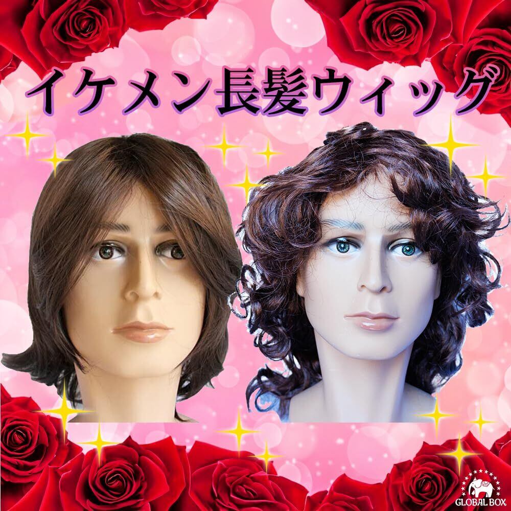 GLOBAL BOX メンズ 長髪 ウィッグ かつら ロン毛 コスプレ 茶髪 モノマネ 余興 面白 フリーサイズ