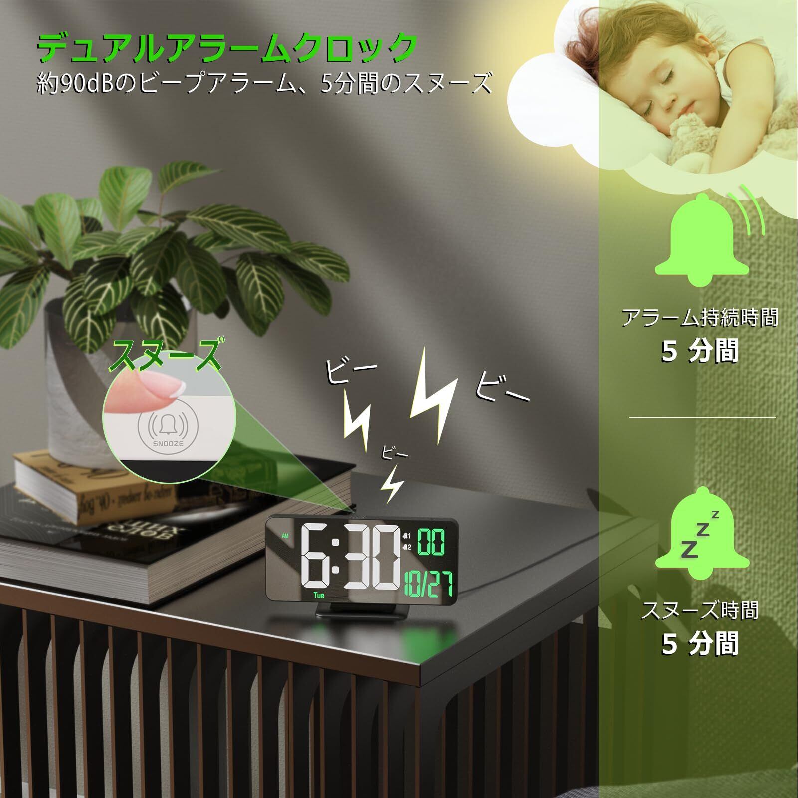 【スヌーズ機能付きデュアル目覚まし時計】この時計は2セットのアラーム時刻を設定可能、オプションとして、平日、週末、毎日の 3 つの異なるアラーム サイクルがあります。目覚まし時計にはスヌーズ機能も付いており、 アラームが鳴ったら、スヌーズ ボタンを押すと、さらに 5 分間の仮居眠り時間を得ることができます。