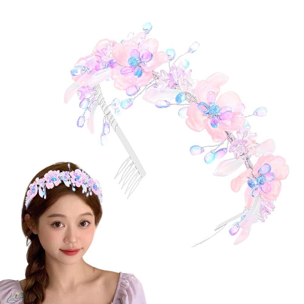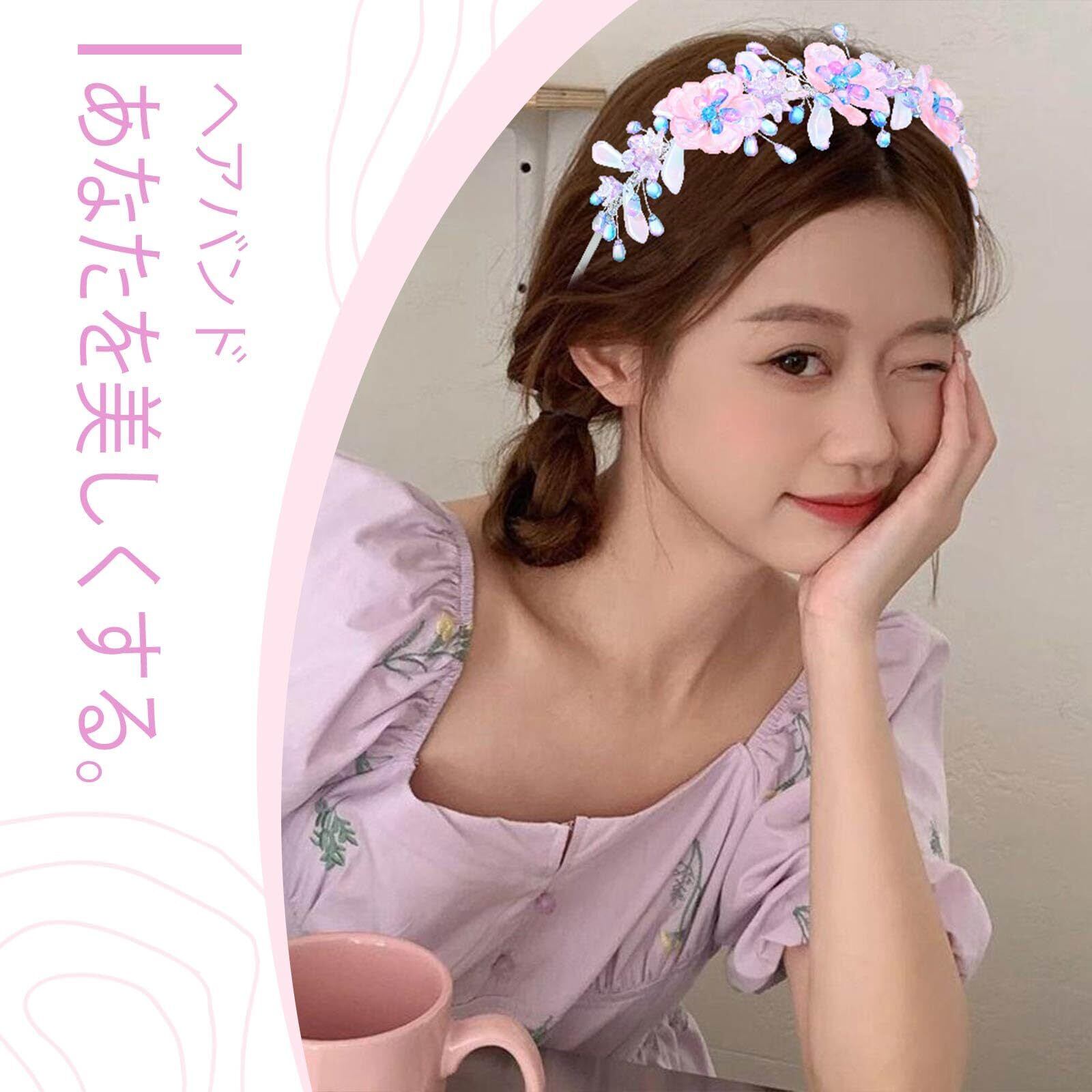 ヘアゴム クリスタル パール ヘアバンド 花びら 着物 卒業式 野外撮影 大人スタイル ピアノ発表会 発表会 花火 パーティー 誕生日プレゼント 子供 大人 ヘアアクセサリー (Free, ピンクパープル)