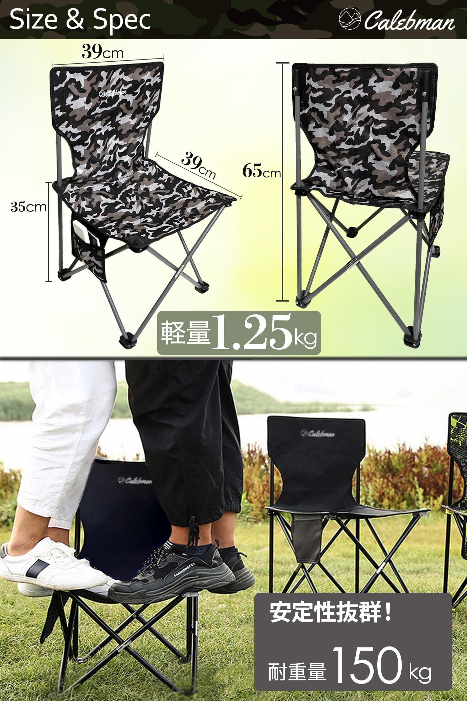 【商品仕様】○カラー:白黒迷彩、ベージュ、無地ブラック ○サイズ:縦39cm×横39cm×高さ65cm ○重量:1.25kg ○耐重量150kg ○素材:スチール、600Dオックスフォード生地 ○セット内容:背もたれ付アウトドアチェア、収納袋 ○用途:キャンプ、釣り、登山、BBQ、海、遠足、公園、テーマパーク、ベランダ、ガーデニング、行列の待ち時間用など ○ブランド:Calebman <安心の100日付>