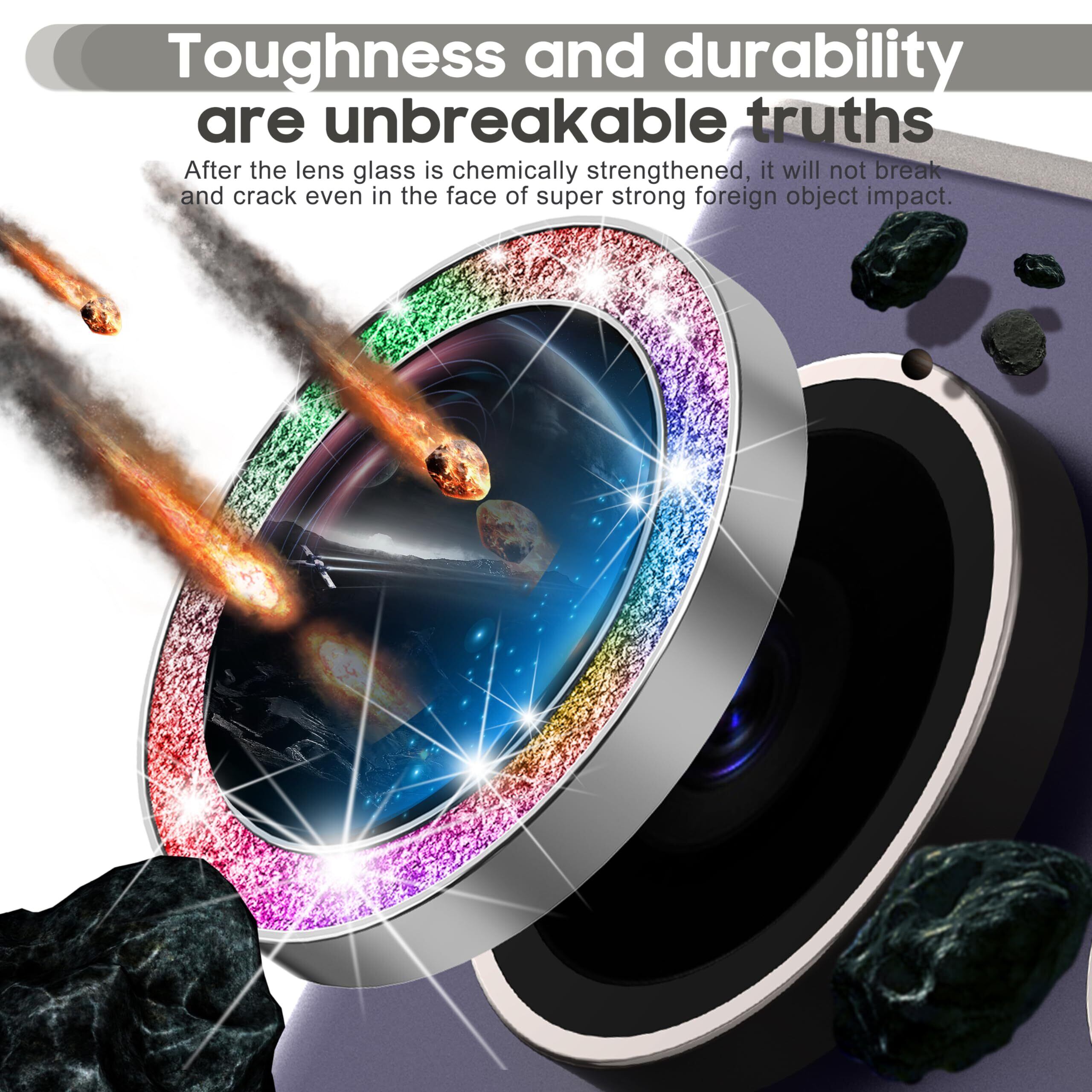 【特別設計】デザイン性あふれる合金フレーム、シンプルで先進的なラインにより、レンズ保護膜をさらにユニークにしています。エッジが微細なキラキラのスパンコールで覆われ、スマートフォンのレンズを美しくエレガントにしています。