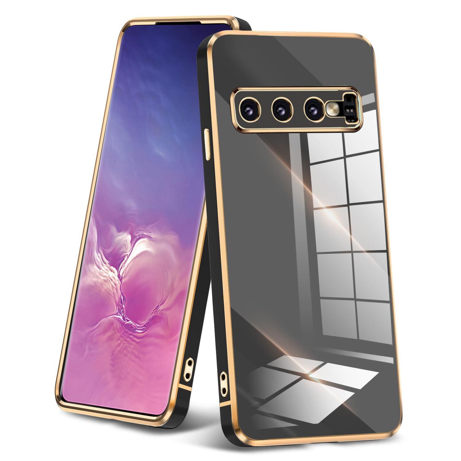 Galaxy S10 Plus 用ケース クリア 耐衝撃 TPU ケース レンズ保護 ソフトケース 透明 メッキ加工 ワイヤレス充電 ギャラクシーS10 Plus 用カバー ラップホール付き 薄型 軽量 メッキ枠 ブラック/ゴールド JP2-74