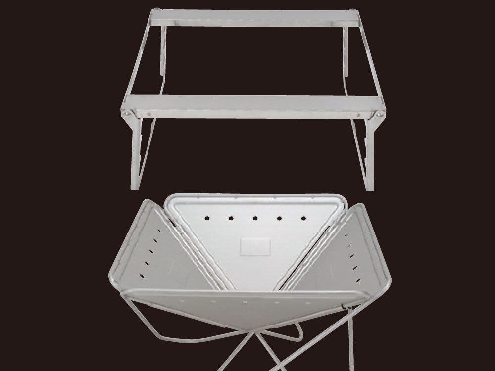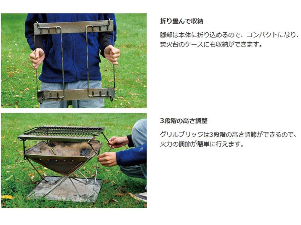 焚火台LにグリルブリッジLをセットすることで、グリルネットやグリルプレートなど調理用オプションを使うことができます。3段階の高さ調整で、火加減をコントロールできます。