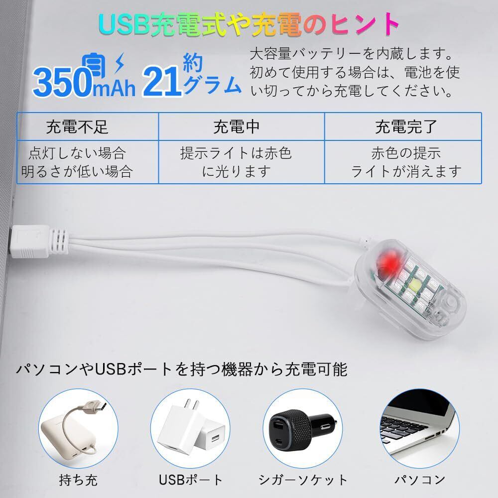 <製品仕様>色は白/赤/緑/ブルー/イエロー/パープル/アイスブルーの7色で、高速フラッシュ、緩速フラッシュ、単色点灯や多色サイクルなどのモードがあります。3.7V/350mAhの大容量バッテリー内蔵、充電時間は約20分です。ライトが点滅している間は約40分使用できます(モードごとの使用時間は異なる場合がありますのでご了承ください)。※サイズ:52mm×34mm×22mm。※重さ:約20グラム(片方)。※バッケージ内容:ストロボライト*4、リモコン*1、3in1 USB充電ケーブル*1、ゴム輪*8、面ファスナー*4、CR2016ボダン電池*1
