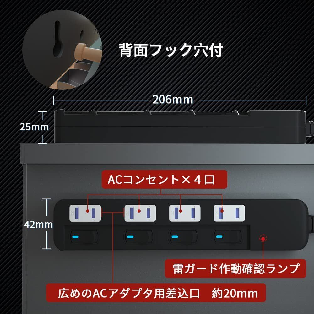 SAYBOUR 電源タップ 雷ガード 個別スイッチ 節電タップ おしゃれ省エネ ACコンセント 4個口LED PSE認証済 延長コード (1m, ブラック)