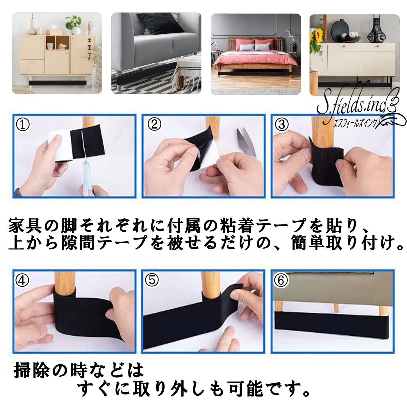 家具の脚それぞれに付属の粘着テープを貼り、上から隙間テープを被せるだけなので、簡単取り付け。掃除の時などはすぐに取り外しも可能です。