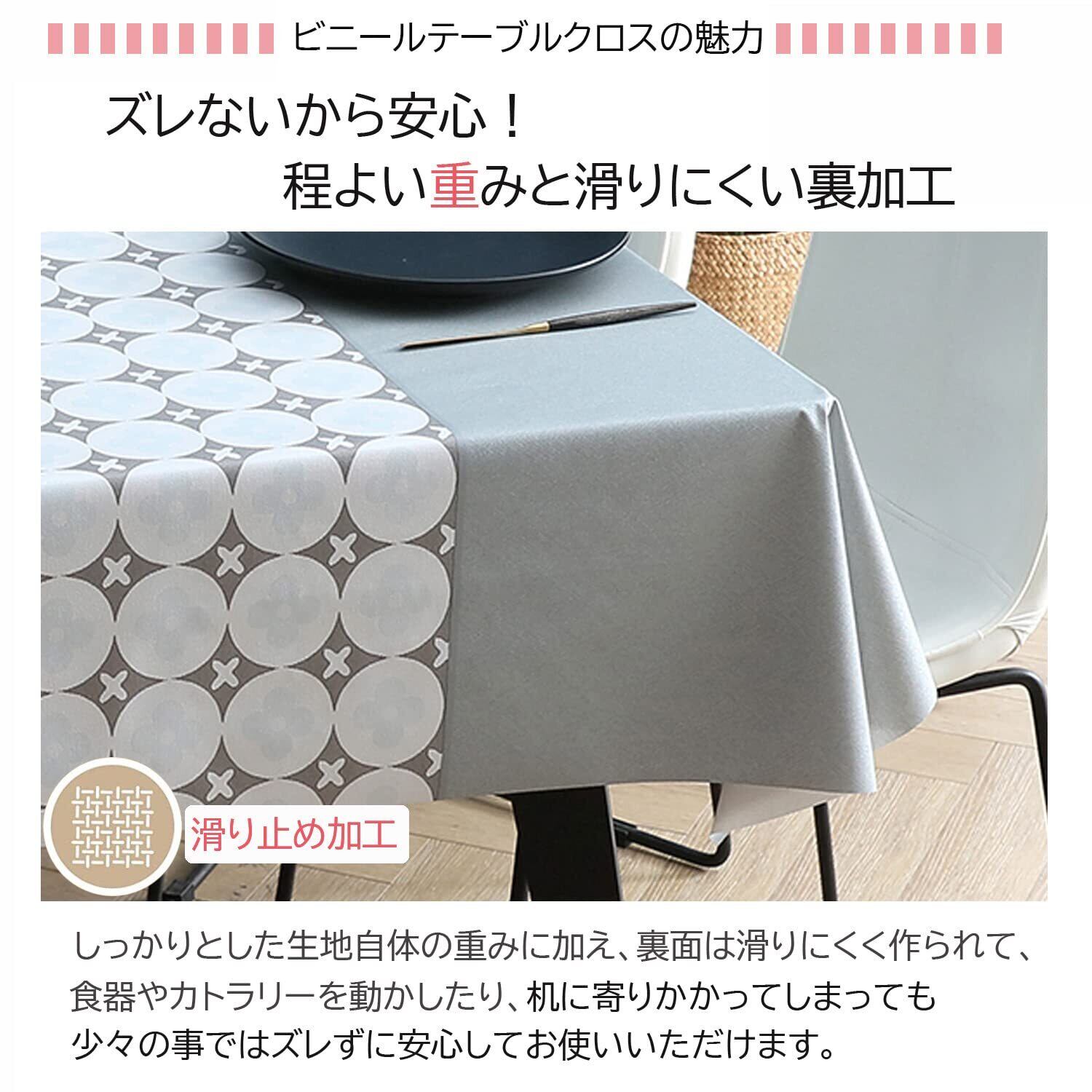 北欧デザイン:グレー色をベースにホワイトな花柄がプリントされて、どんな空間にも馴染む柄、落ち着きのある空間を演出します。厚手で重さもちょうどいい、ズレにくいしめくれにくいテーブルカバーです。