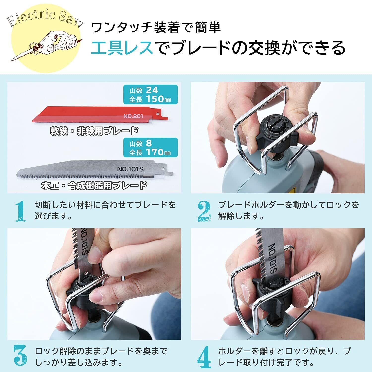 ●付属品:木工・合成樹脂用ブレード(山数8、全長170mm)×1枚、軟鉄・非鉄用ブレード(山数24、全長150mm)×1枚。