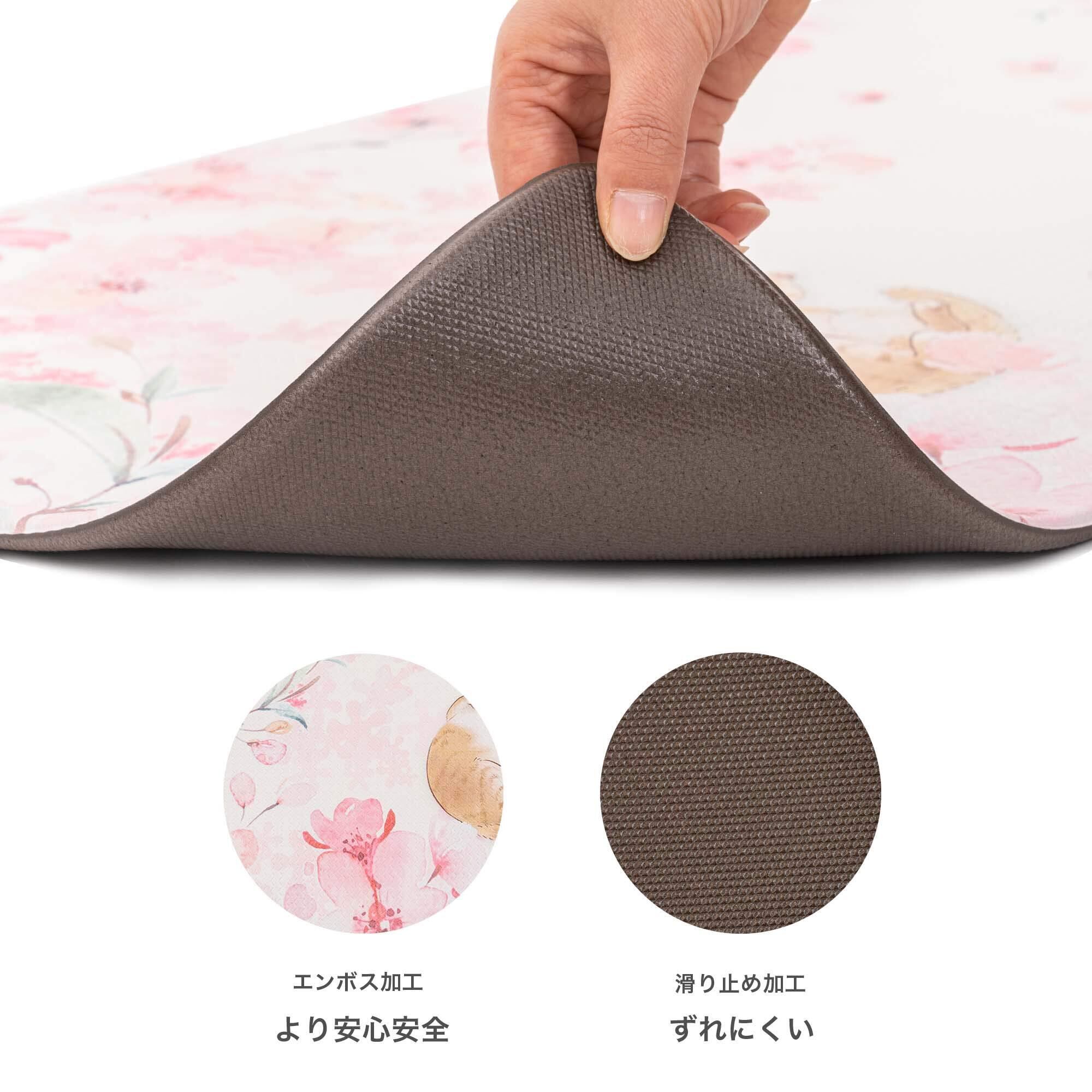 「エンボス加工&滑り止め」表面は目立たないエンボス加工で滑り止めの役割があり、裏面もズレにくい仕様です。床暖房でもご使用いただけます。