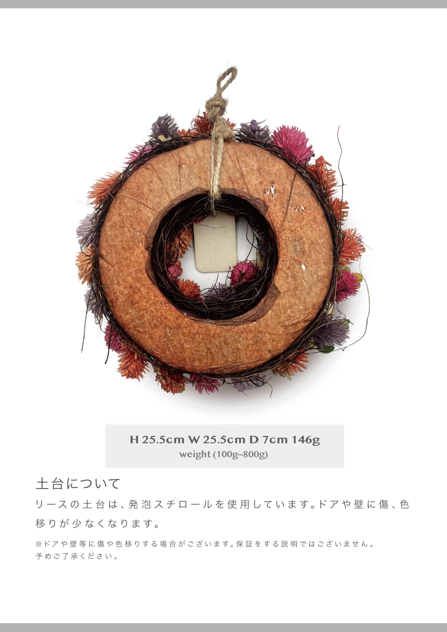 ■素材について■ 天然素材を使用したフラワーリースです。 木をスライスしてお花に見立てたり、葉っぱをドライにして色を染めたりと天然素材を加工しています。 <BR> 後ろの部分に麻紐が付いております、ひっかけて飾ってください。 ※以上の内容はする説明ではございません。予めご了承ください。