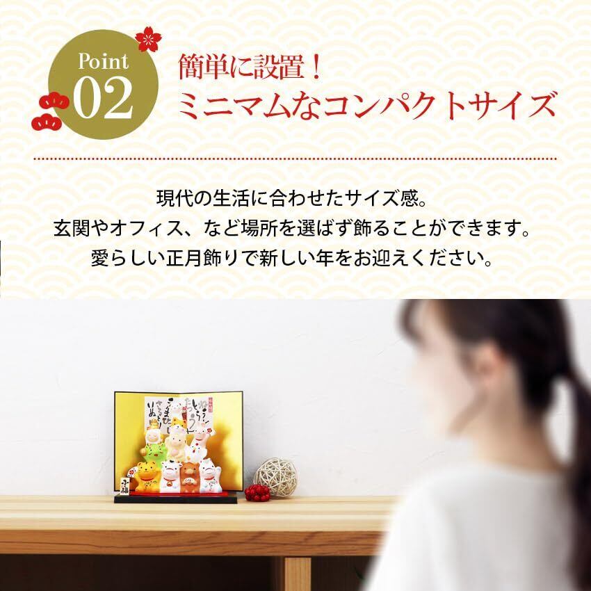 スペック:全体(横幅21×奥行24×高さ16cm) セット内容:丑飾り・屏風・毛氈・飾り台・箱入り