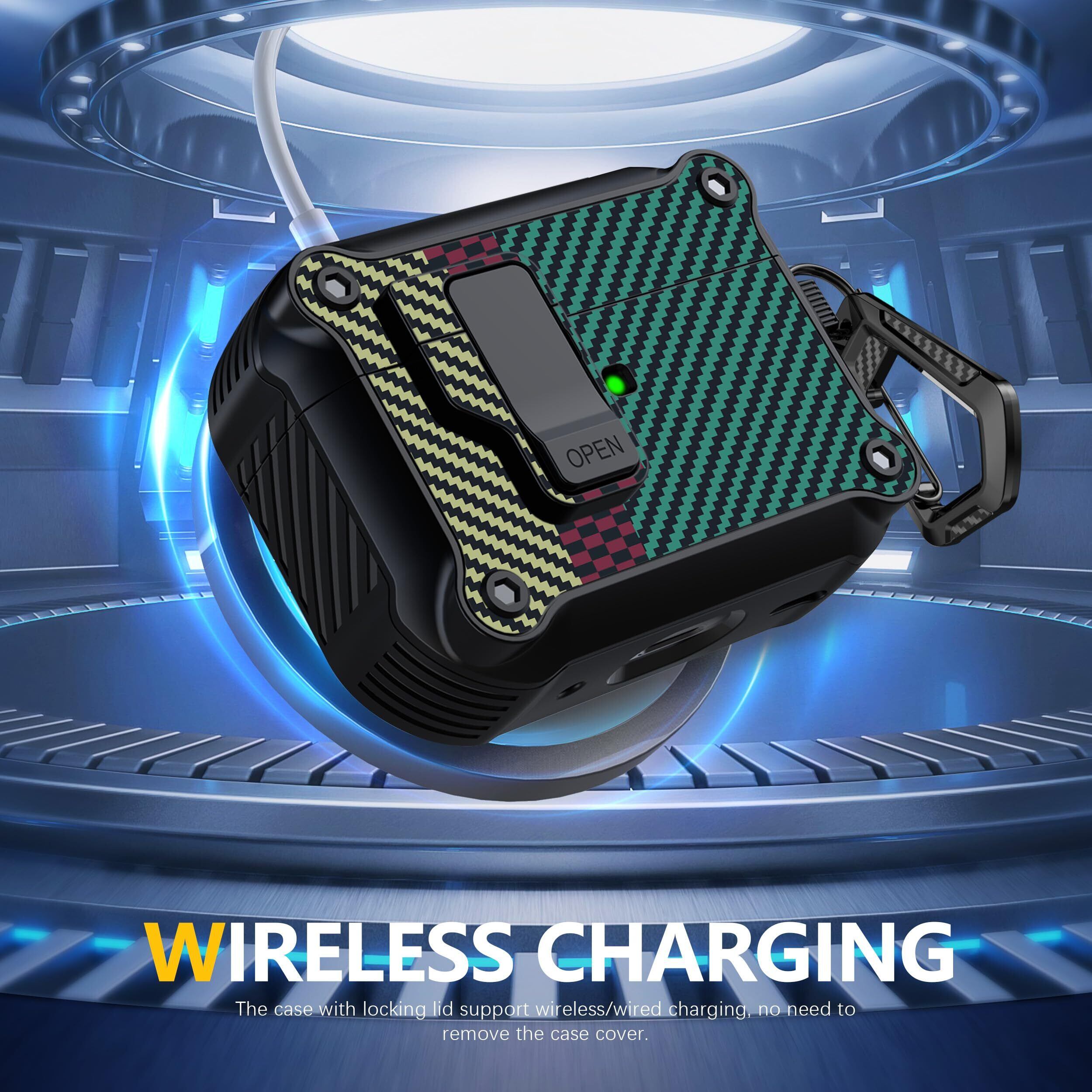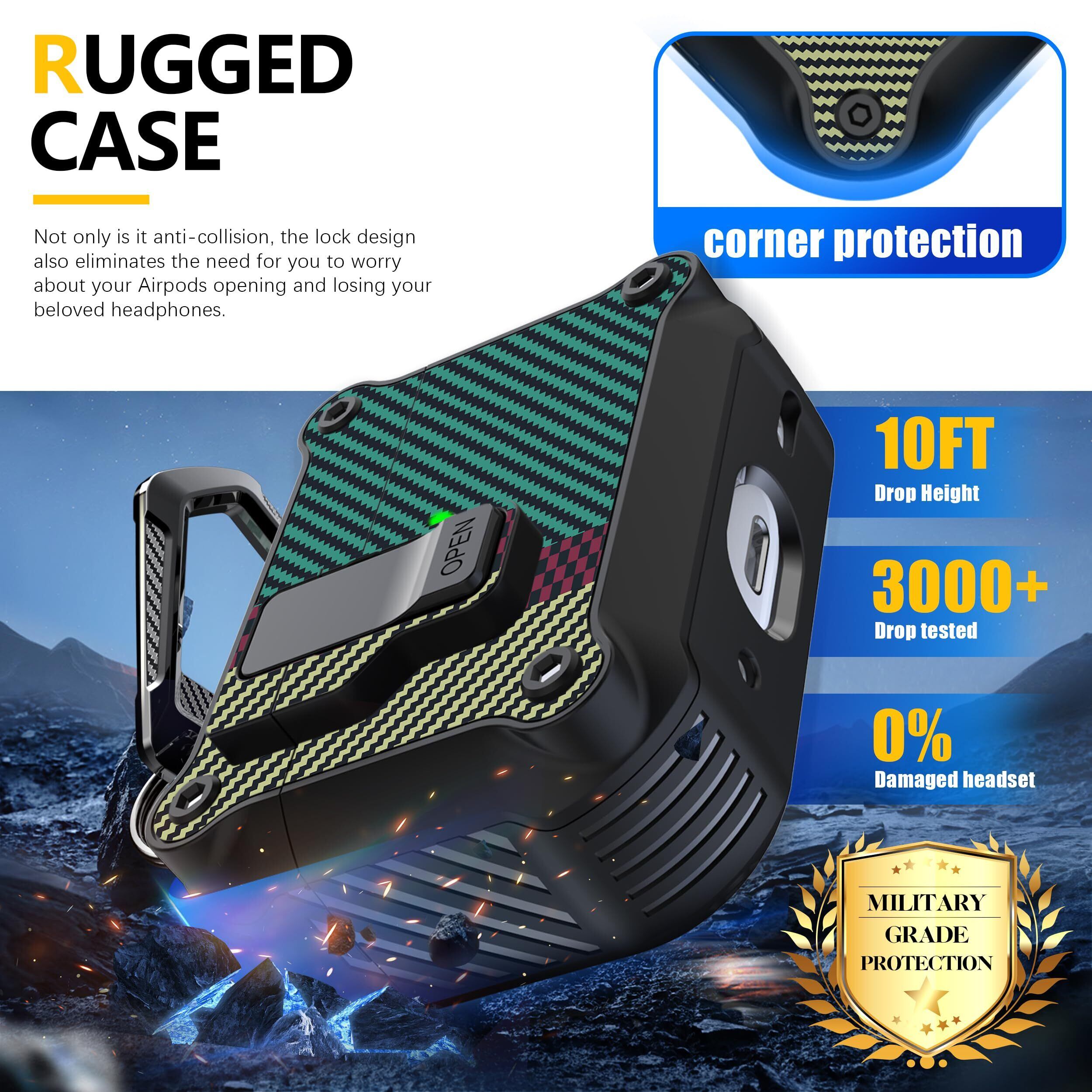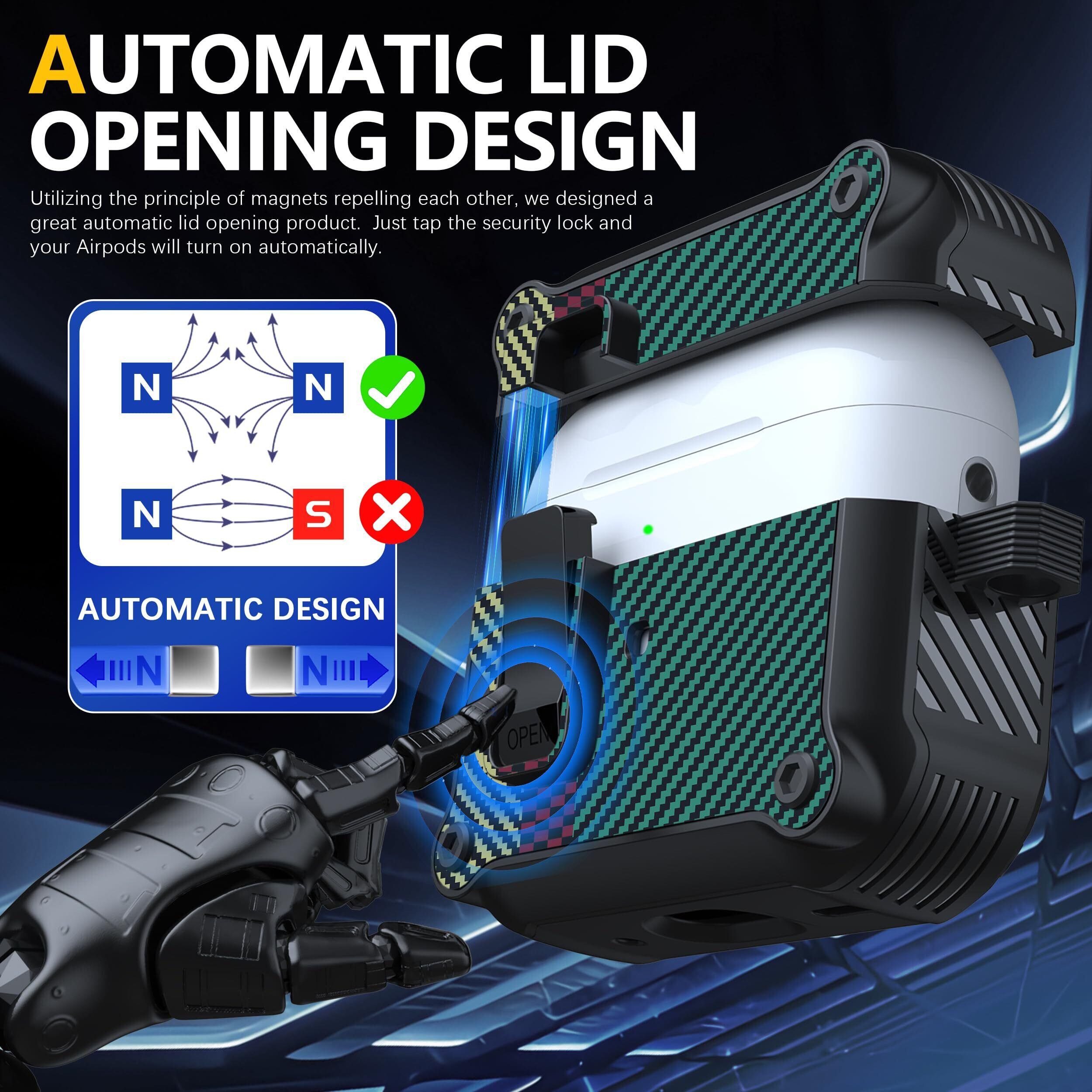 RFUNGUANGO AirPods Pro 第 2/1 世代ケースカバー 安全ロッククリップ付き 自動ポップアップケース フルボディ耐衝撃ハード保護カバー AirPods Pro 2 ケース (2023/2022/2019) 用 - カーボンファイバーグリーン