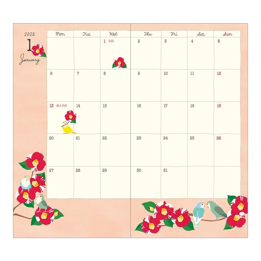色とりどりのトリたちと鮮やかな季節の植物を組み合わせたダイアリーです。仲睦まじい様子やお花をくわえたり首をかしげたりしているかわいらしいポーズに癒されます。見開きで1ヵ月のスケジュールが管理できる、月間ブロックタイプ。薄く持ち運びに便利なスリムサイズの手帳で、カバーの内側にはペンホルダーが付いています。「ポケットダイアリー」は、日常を楽しく彩る手帳シリーズとして1984年に誕生しました。お好みで選べる豊富なサイズとデザインでご好評をいただき、今日まで多くの方にご愛用いただいています。フルカラーの本文は毎ページデザインがかわり、1年間飽きずにお使いいただけます。
