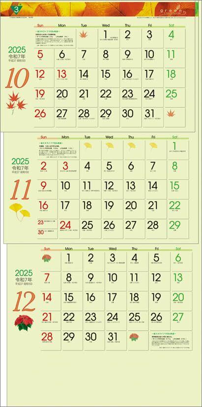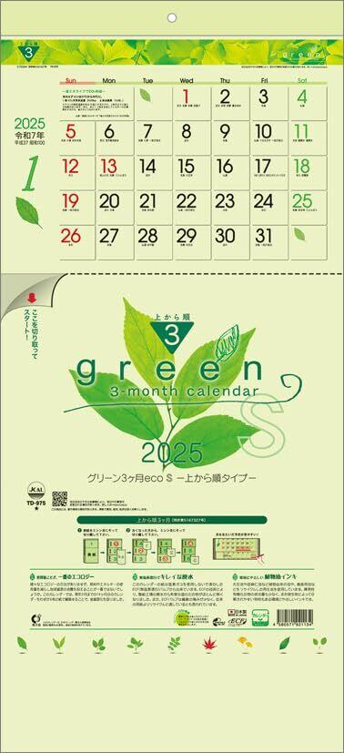 【新春セール】グリーン3ヶ月eco S-上から順タイプ- 2025年 カレンダー 壁掛け CL25-1040