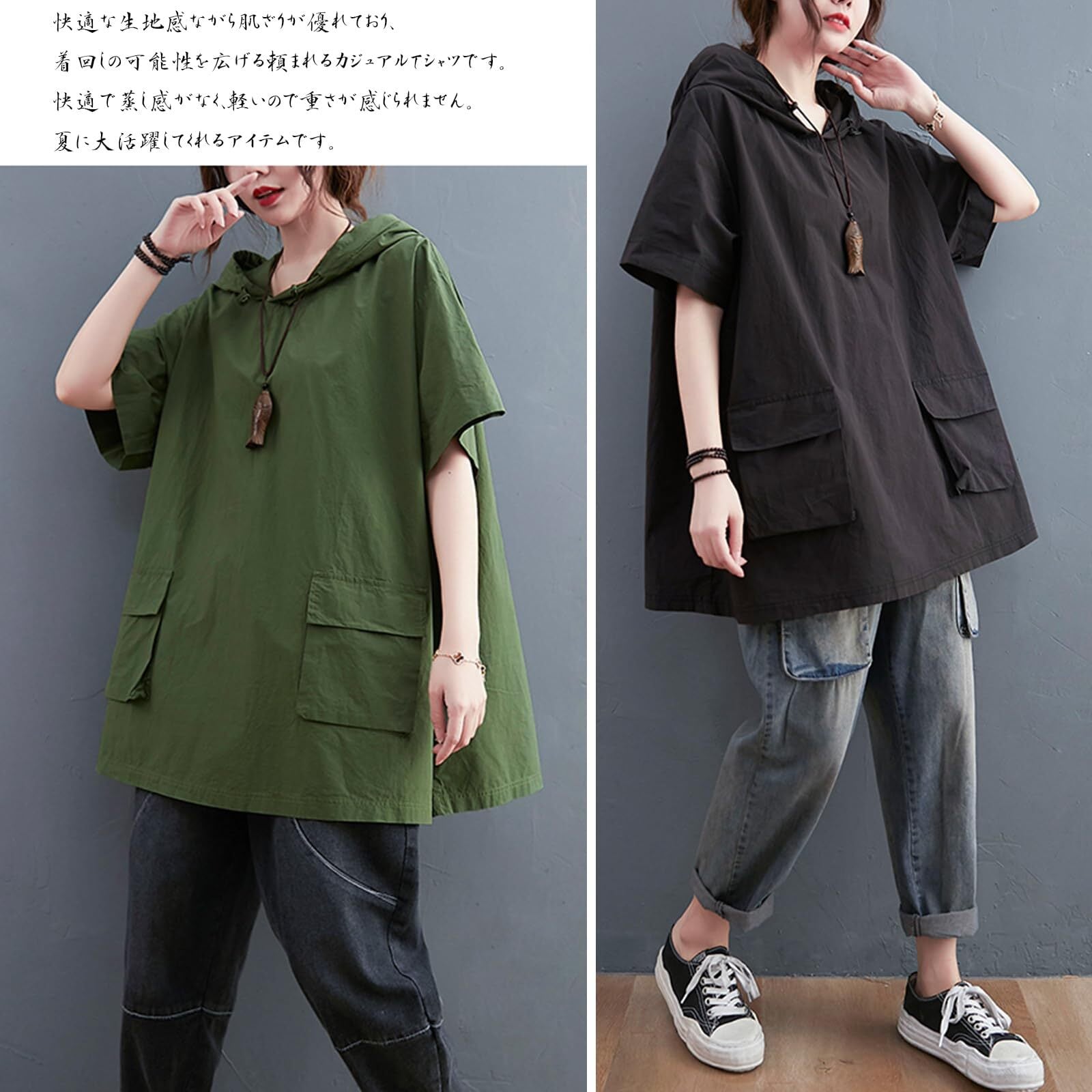 【カジュアル ゆったりフード付きtシャツ】シンプルで上品でエレガントな大人スタイル!フード付きtシャツ、体型カバー 大きいサイズ レディース フ今の季節にはちょうど良さそうです。オーバーサイズな感じも気に入りました。